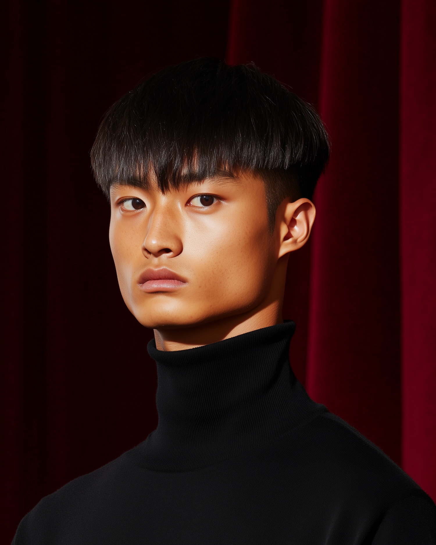 Portrait of a young man with a bowl cut hairstyle, wearing a black turtleneck against a red curtain backdrop, exuding a modern aesthetic.