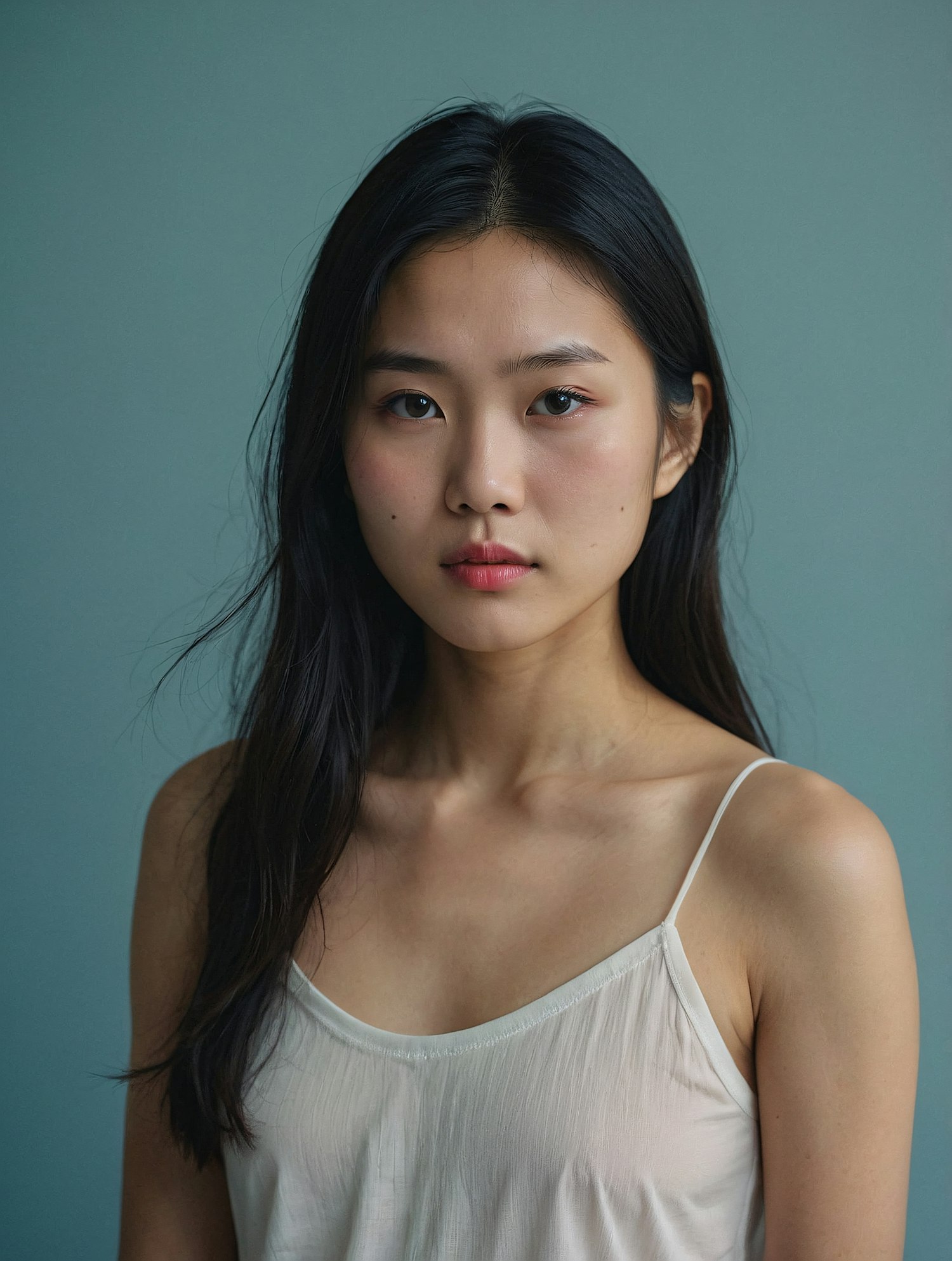 Portrait of a young Asian woman with long black hair, wearing a white top against a muted teal background, looking directly at the camera.