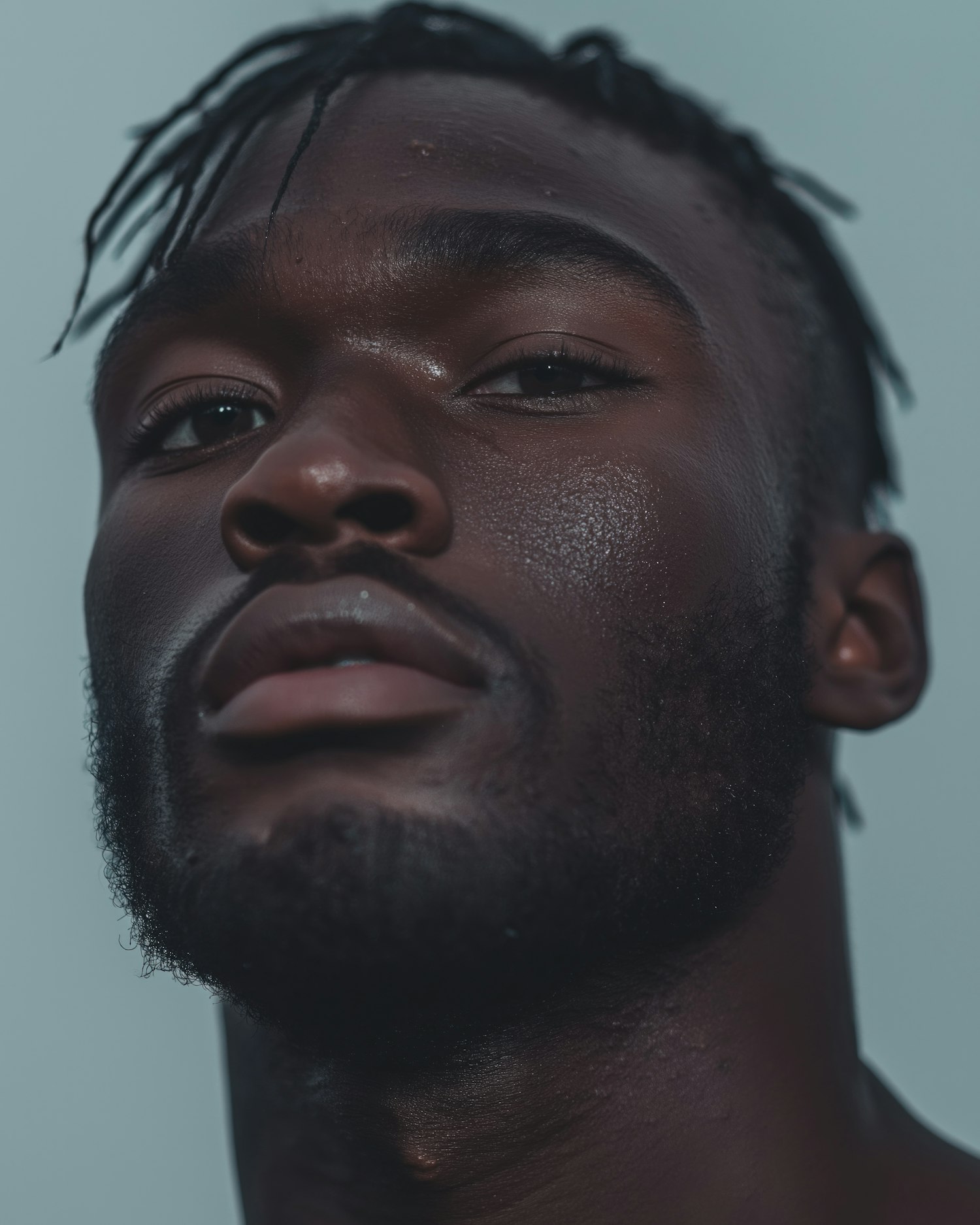 Close-up portrait of a man with dark skin, textured hair, and a groomed beard, set against a muted blue background.