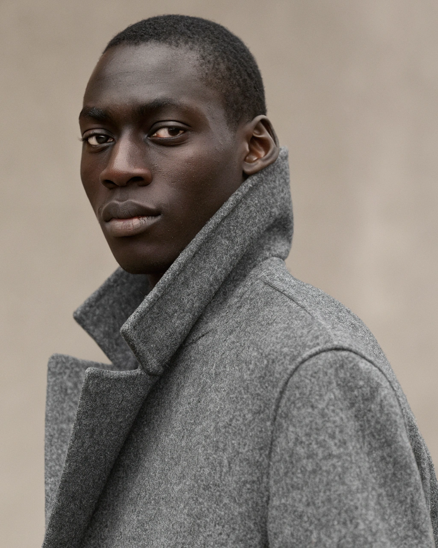 Close-up of a man in a gray wool coat with a high collar, set against a neutral beige background. Calm expression and soft lighting.