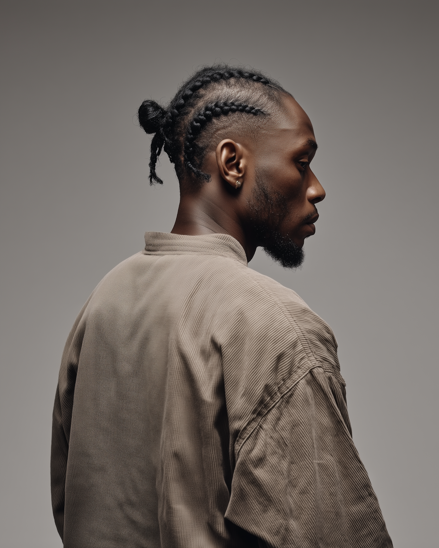 Side-profile of a man with cornrows and a bun, wearing a beige corduroy shirt against a neutral gray background.