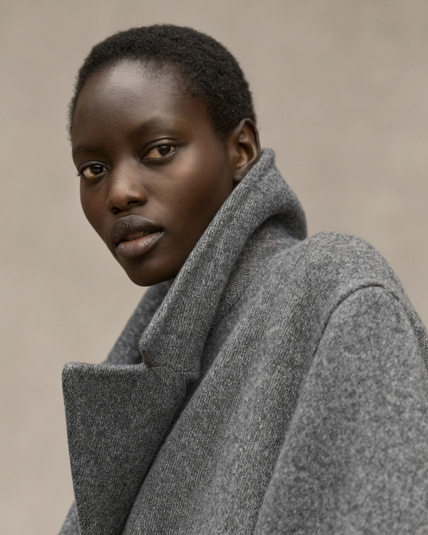 Close-up of a woman in a textured gray coat with a high collar, set against a neutral background. Soft lighting highlights her features.