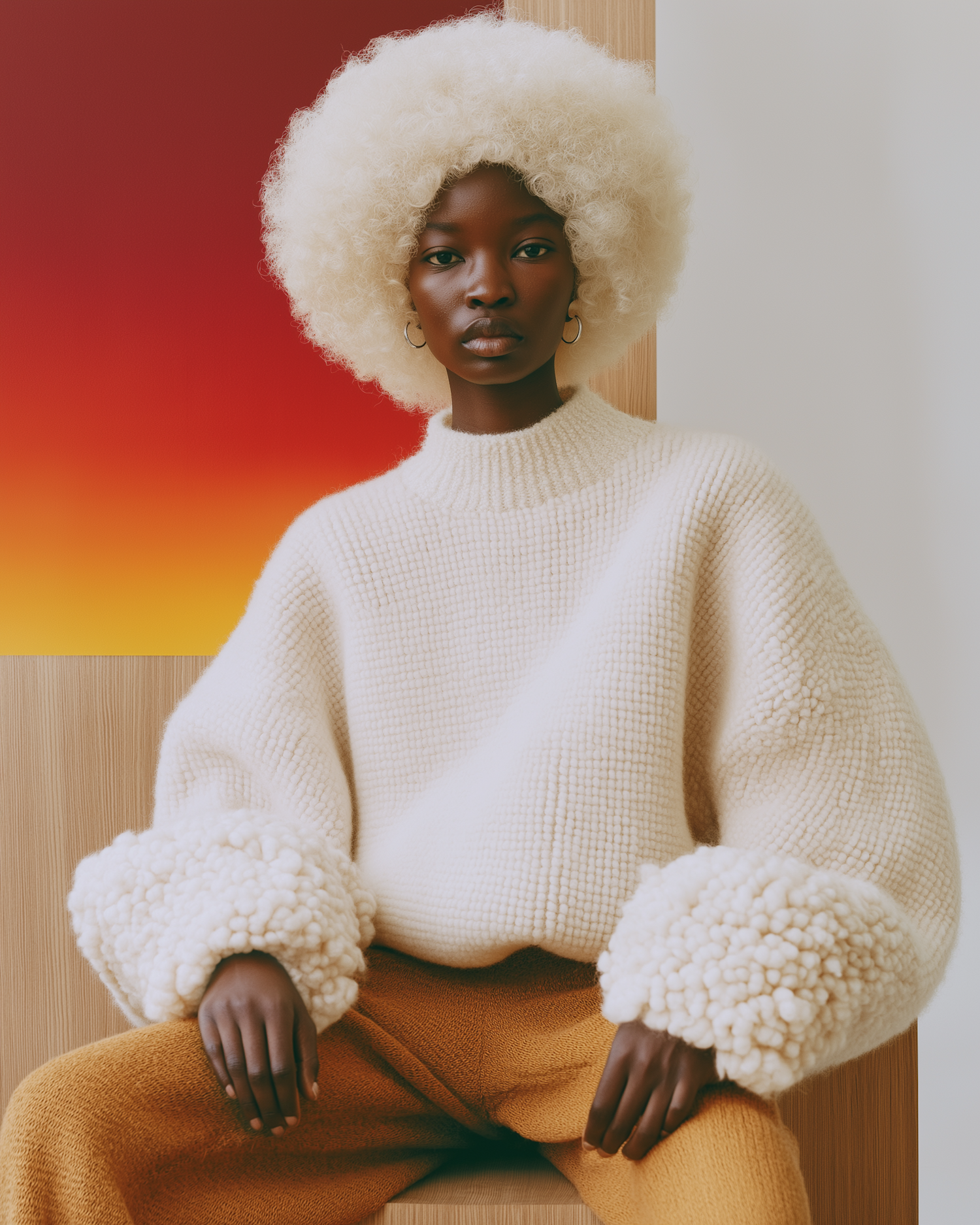 Stylish portrait of a woman with a white afro, cream sweater, and mustard pants against a warm gradient background.