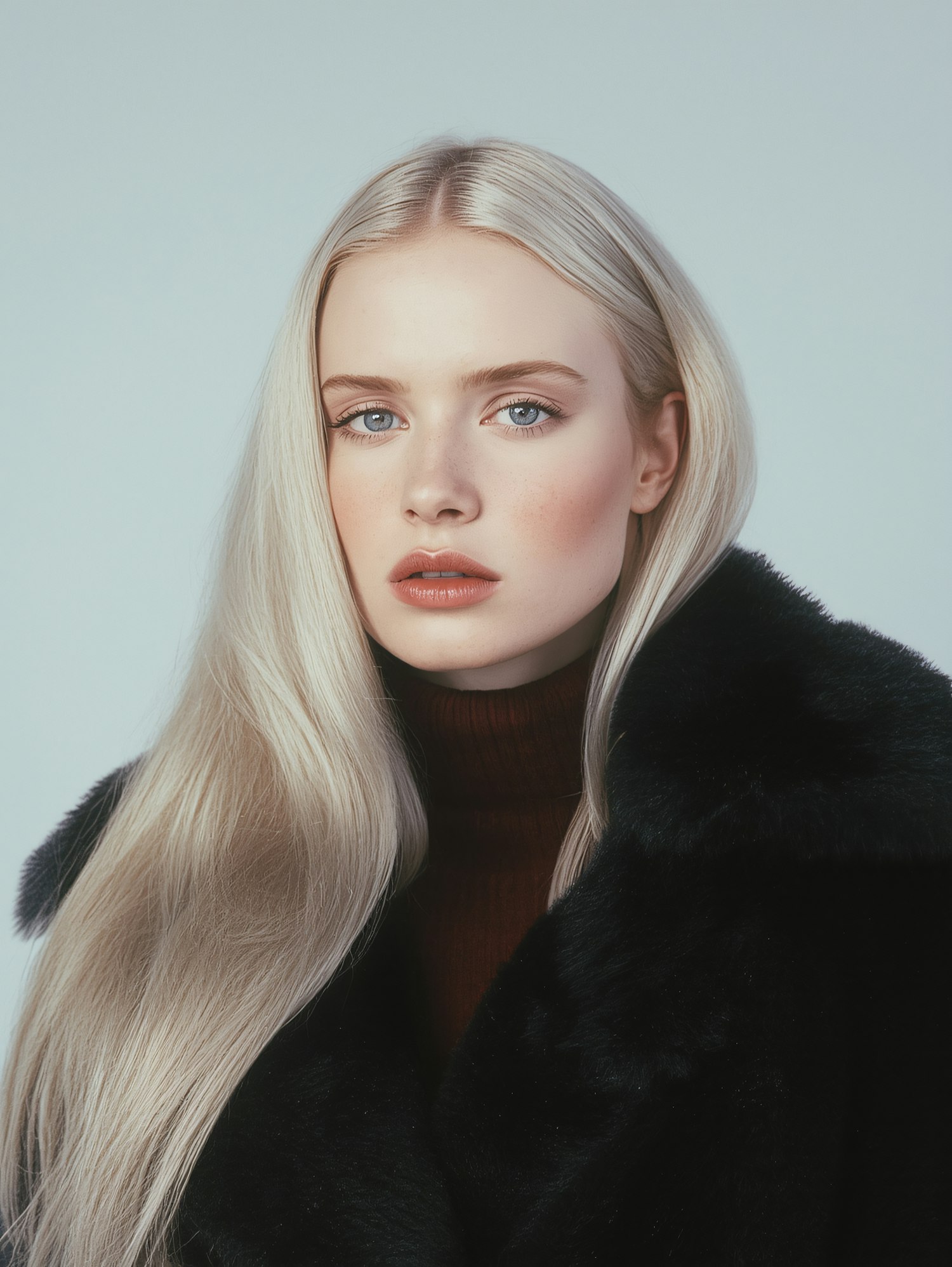 Elegant portrait of a woman with platinum blonde hair, wearing a black fur coat and brown turtleneck against a soft blue background.