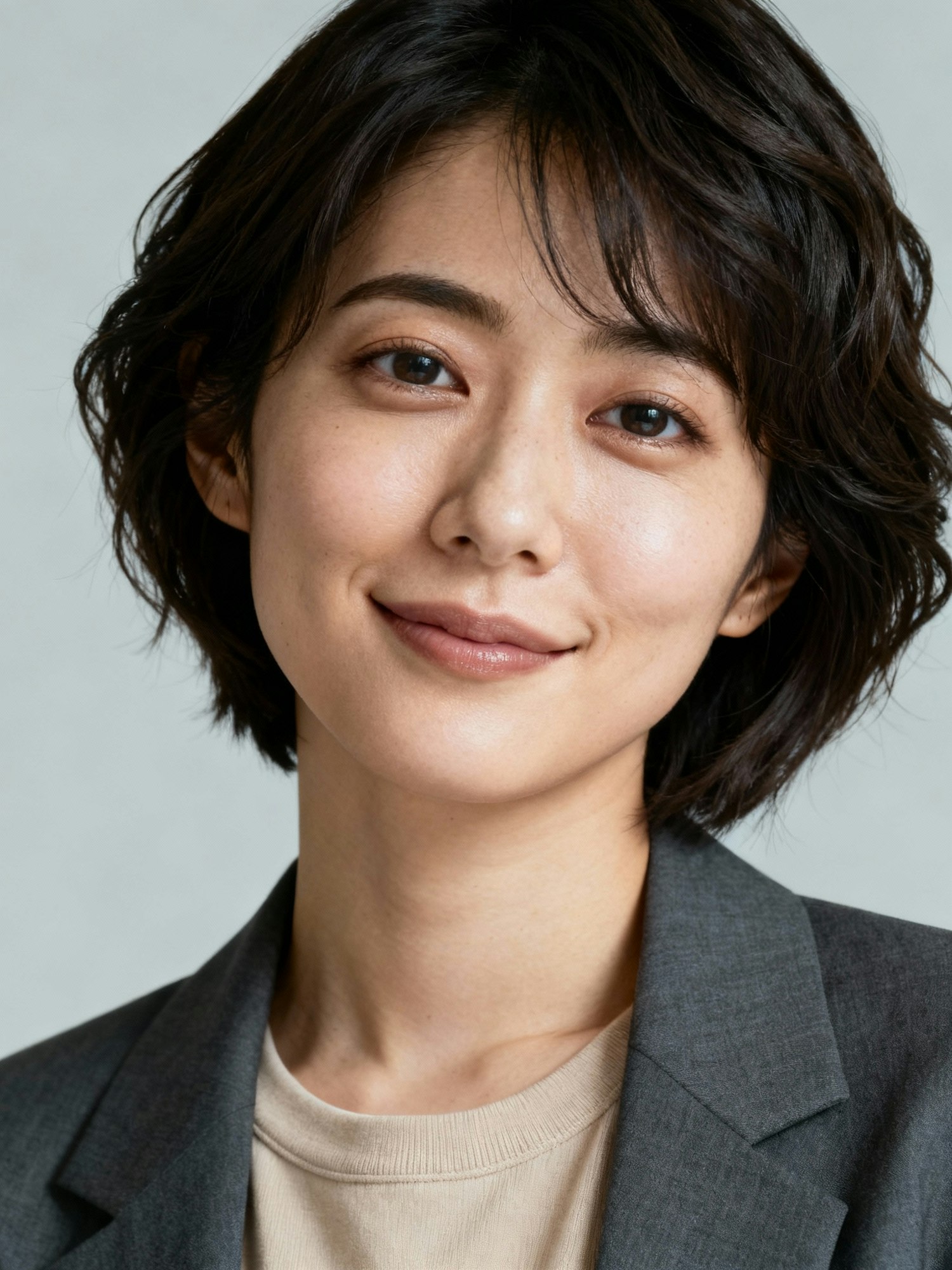 Studio portrait of a Japanese woman data scientist in her early thirties; light skin (cool); neat short wavy hair; slate blazer over beige crew; three-quarter head-and-shoulders (~10° off-axis), eyes to camera; tight head-and-shoulders close-up; neutral seamless backdrop; Rembrandt lighting; 105mm macro-sharp detail; photorealistic, editorial. Expression: subtle half-smile. Negative: “youthifying” skin blur, exaggerated wrinkle removal.