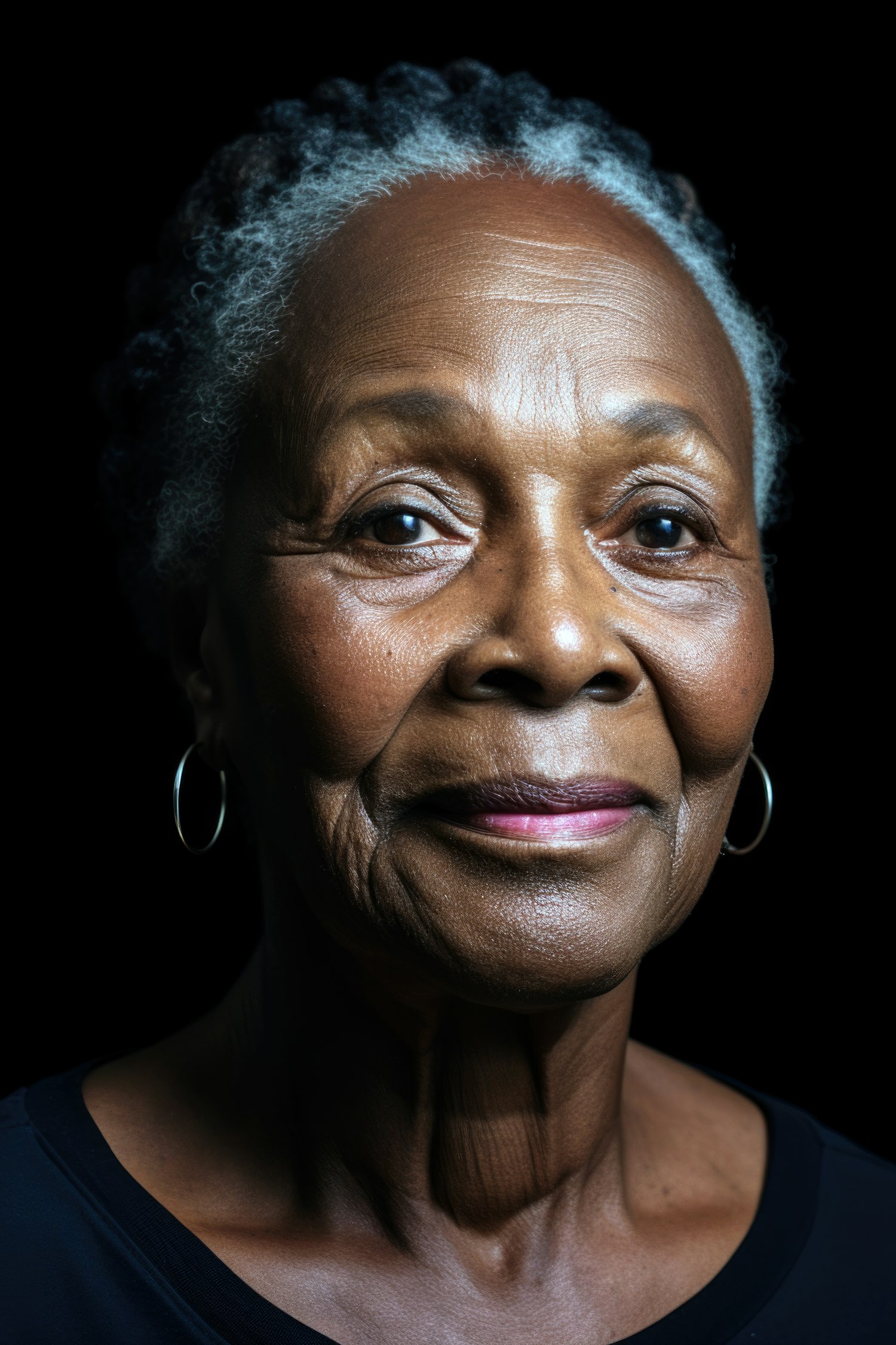 Portrait of an elderly Black woman with gray hair and hoop earrings, exuding warmth and wisdom against a dark background.