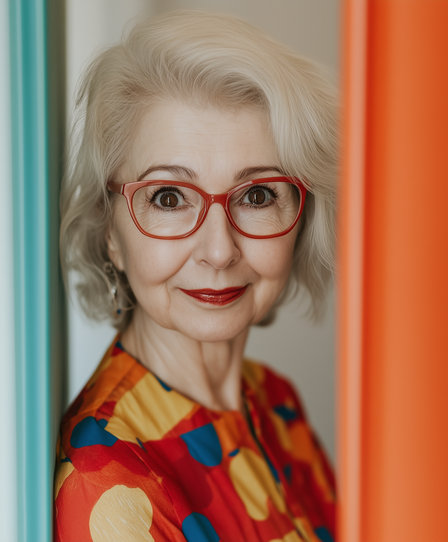 Elegant woman with red glasses and colorful blouse, exuding confidence and style. Vibrant colors and warm expression.