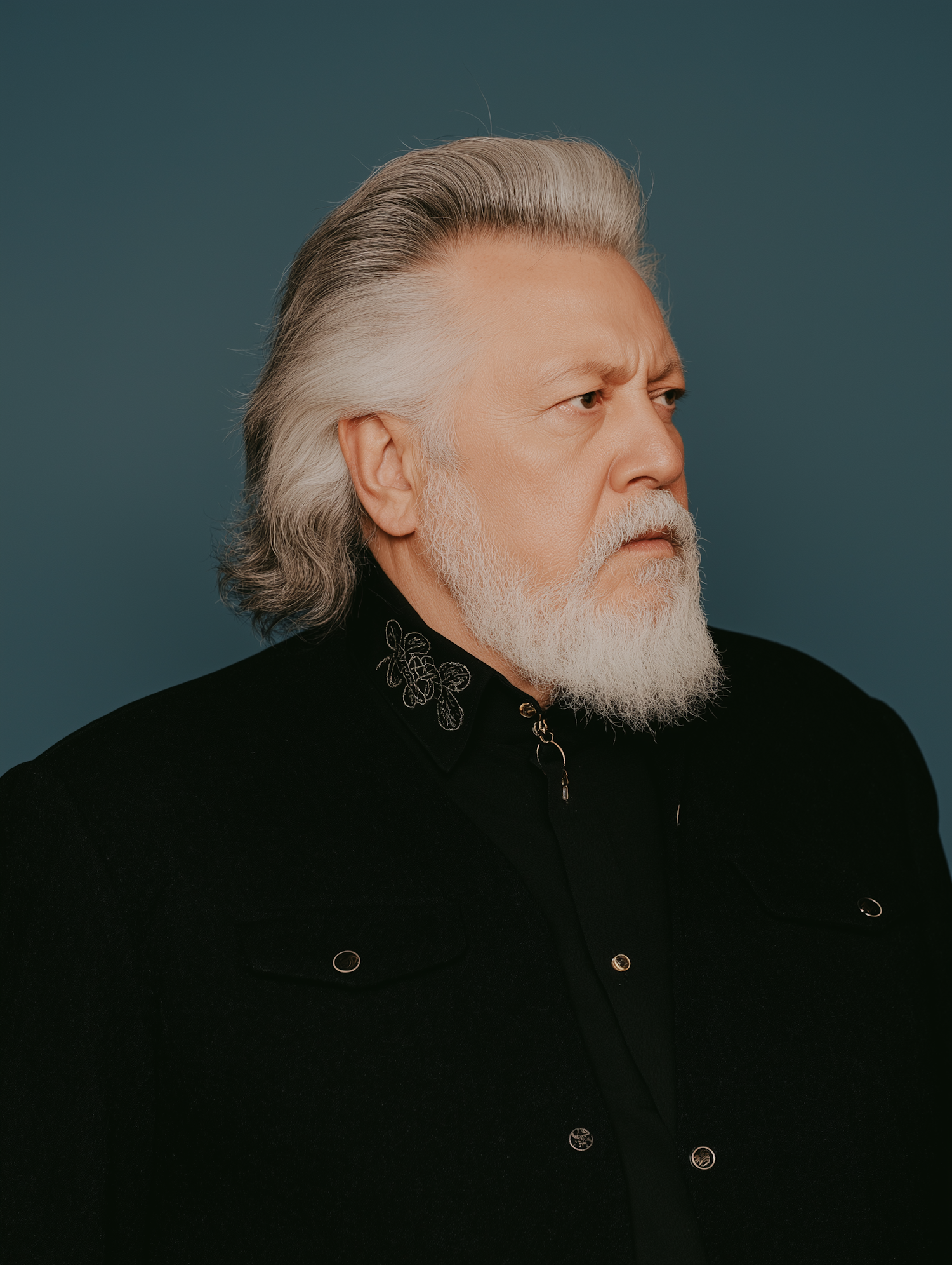 A portrait of a handsome older man with piercing features, dressed in black embroidery against a teal background.