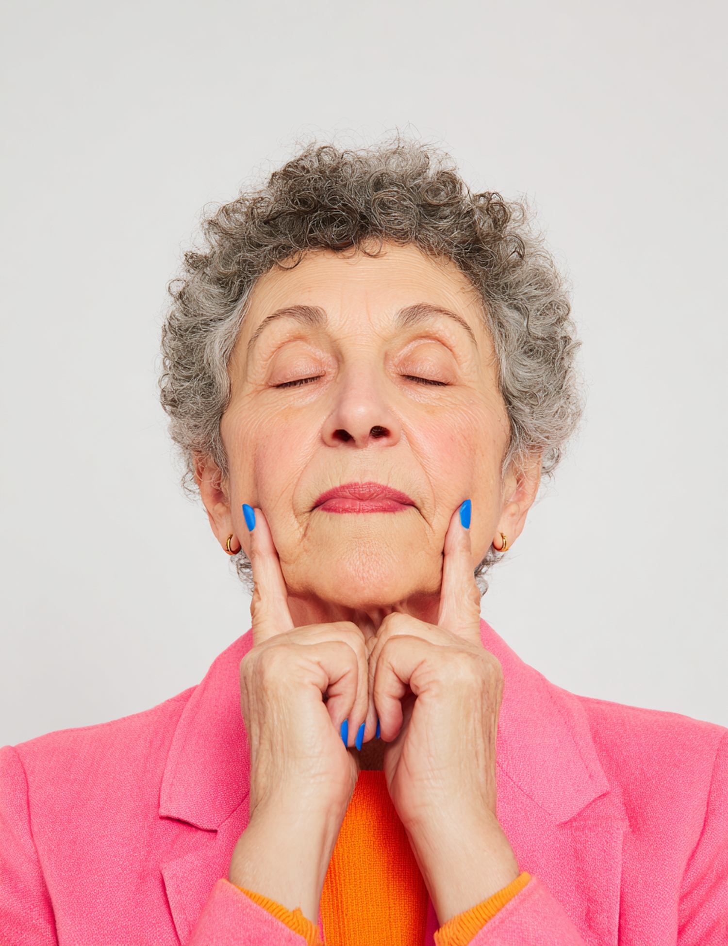 A stylish older woman in a pink blazer and orange top, with blue nails, gently pressing her cheeks with her fingers.