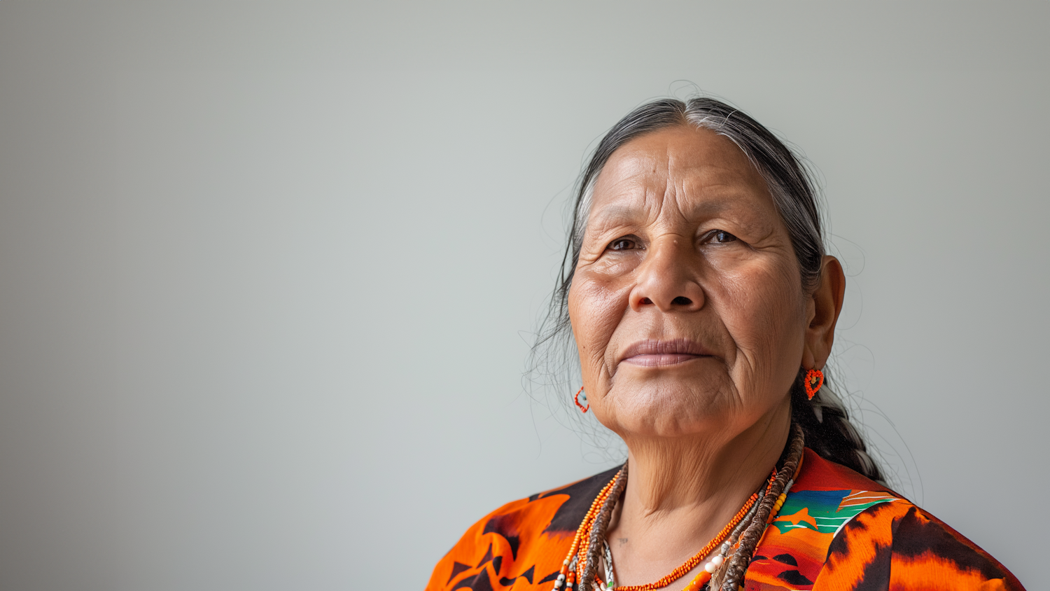 Portrait of a mature woman in vibrant traditional attire, wearing beaded jewelry, with a serene expression against a plain background.
