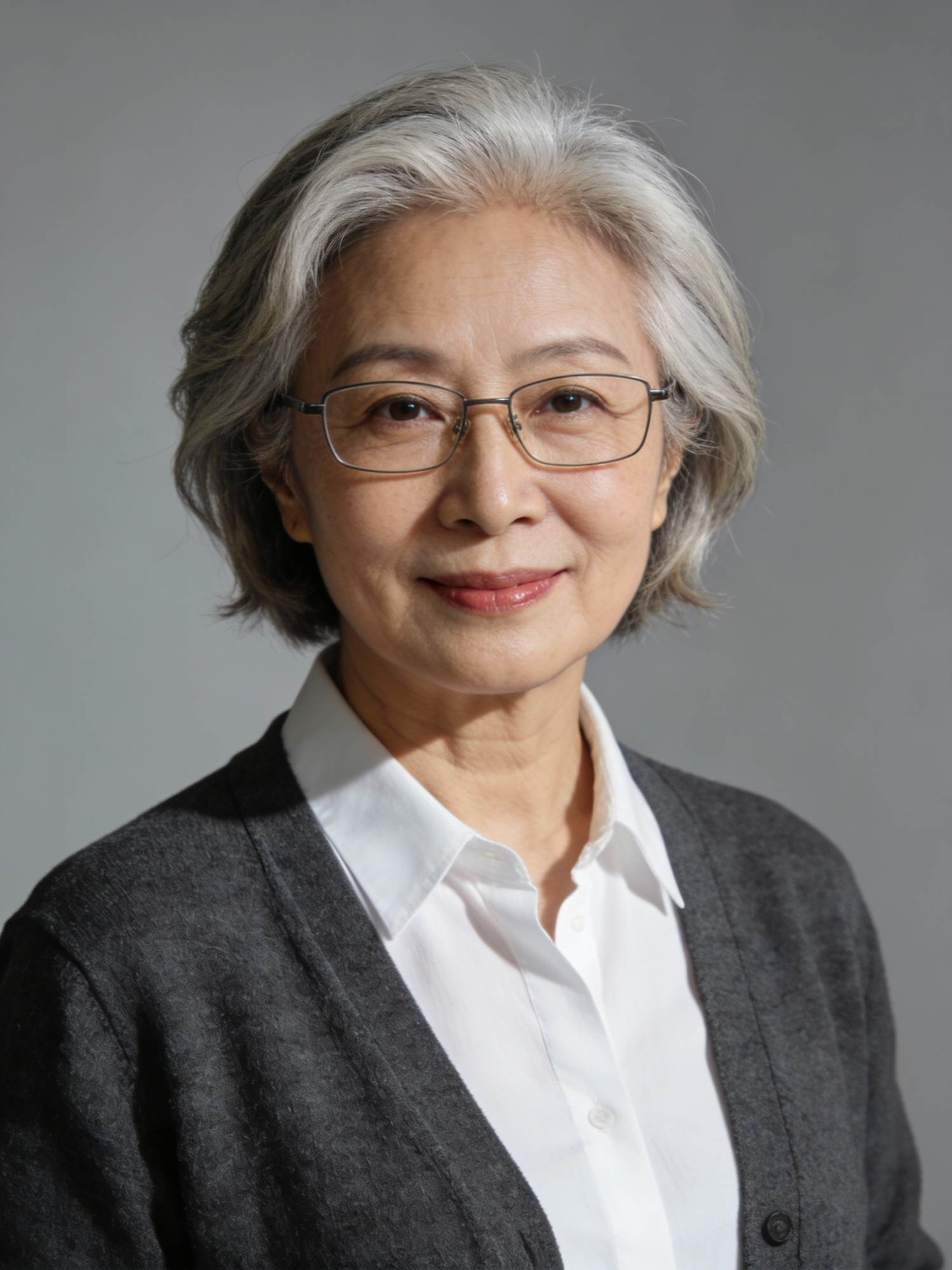 Portrait of an older woman with gray hair, glasses, and a friendly expression, wearing a white shirt and gray cardigan.