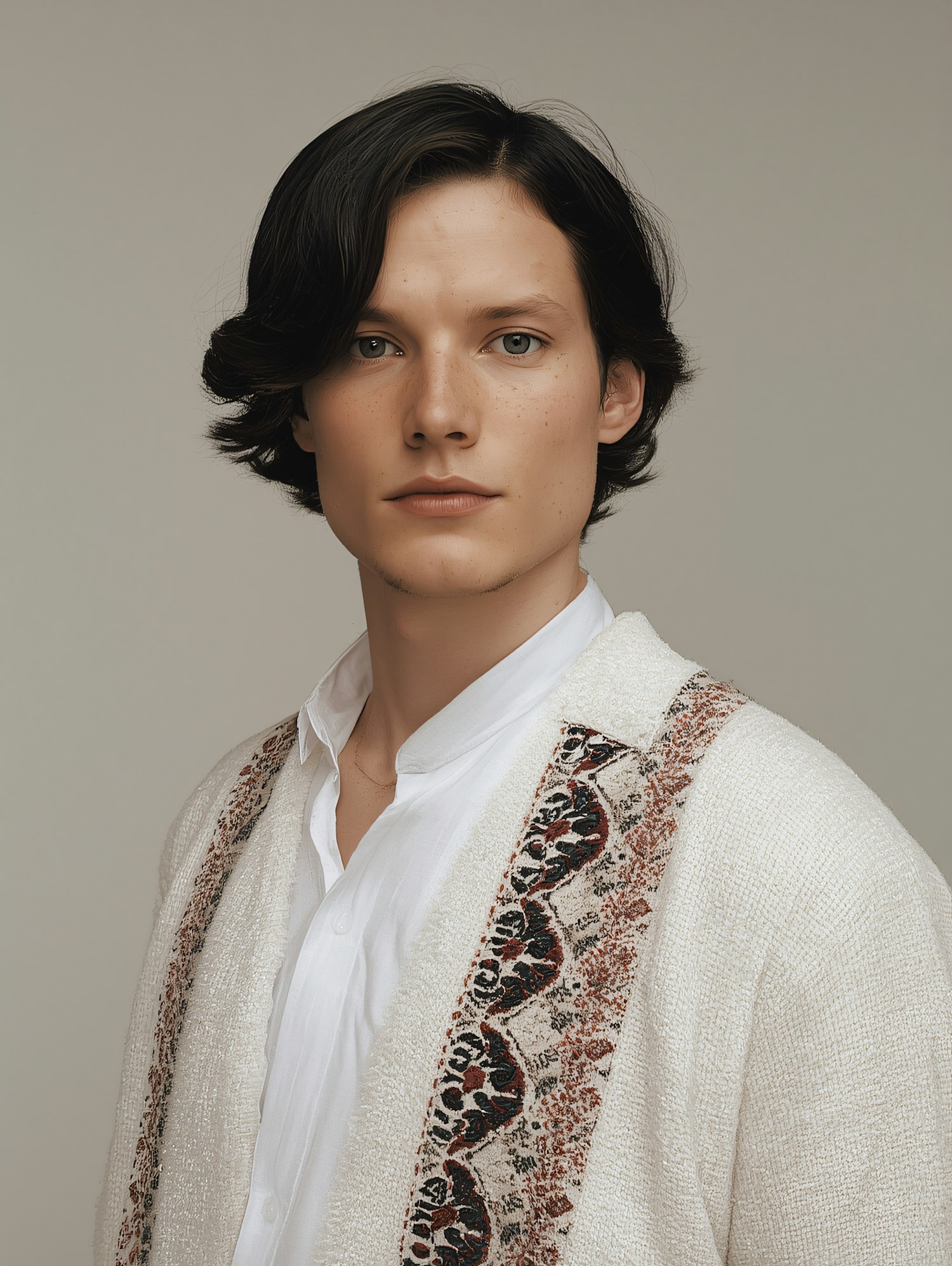 Portrait of a young person with dark wavy hair, wearing a white shirt and patterned garment, set against a neutral background.