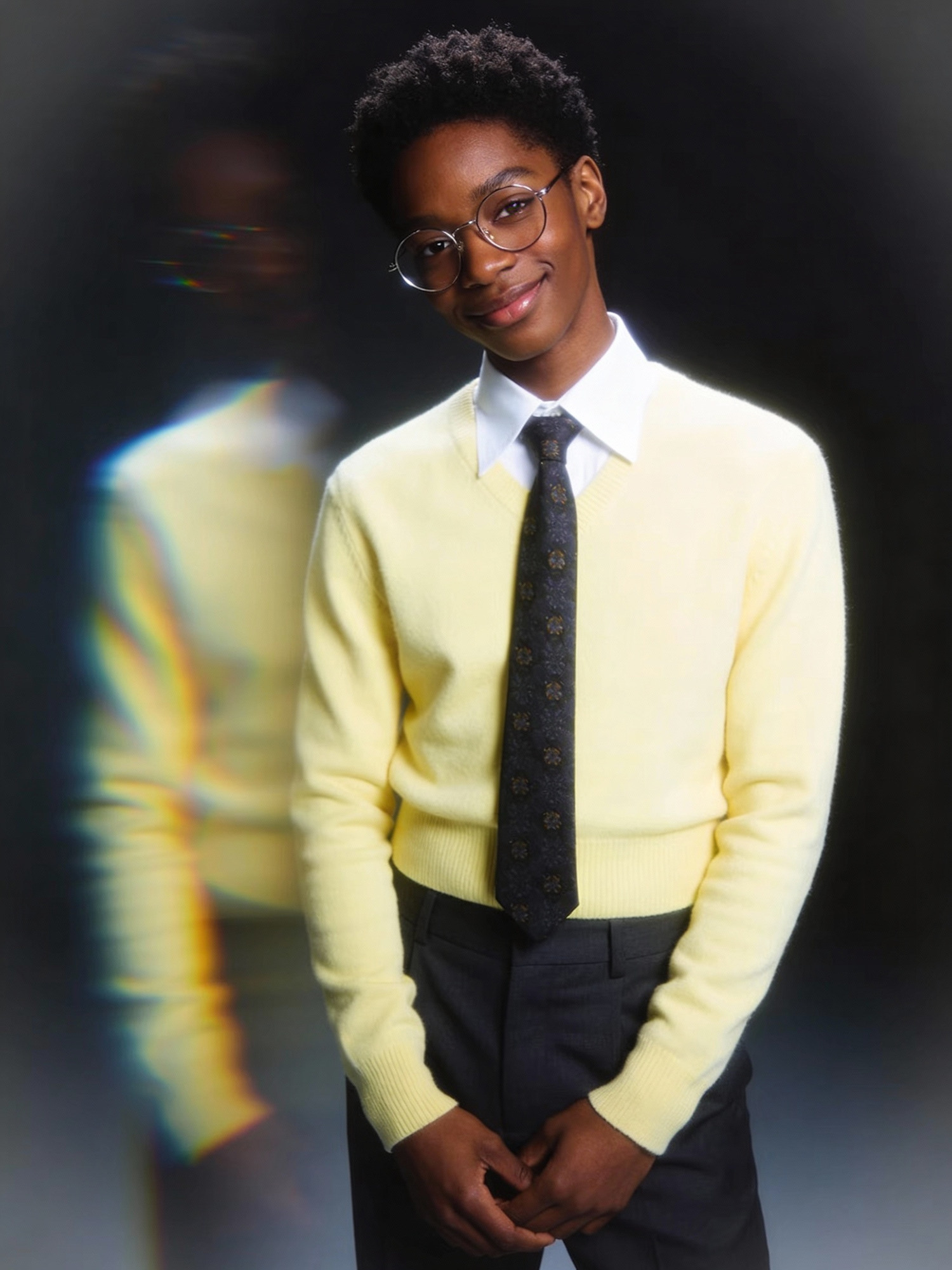 Stylish portrait of a Black person with short curly hair and glasses, wearing a light yellow sweater, white collared shirt, dark patterned tie, and dark trousers. Hands clasped loosely in front, shoulders relaxed, head tilted with a confident half‑smile. Glossy Y2K lighting, soft bloom effect, dark background, sleek fashion editorial mood.