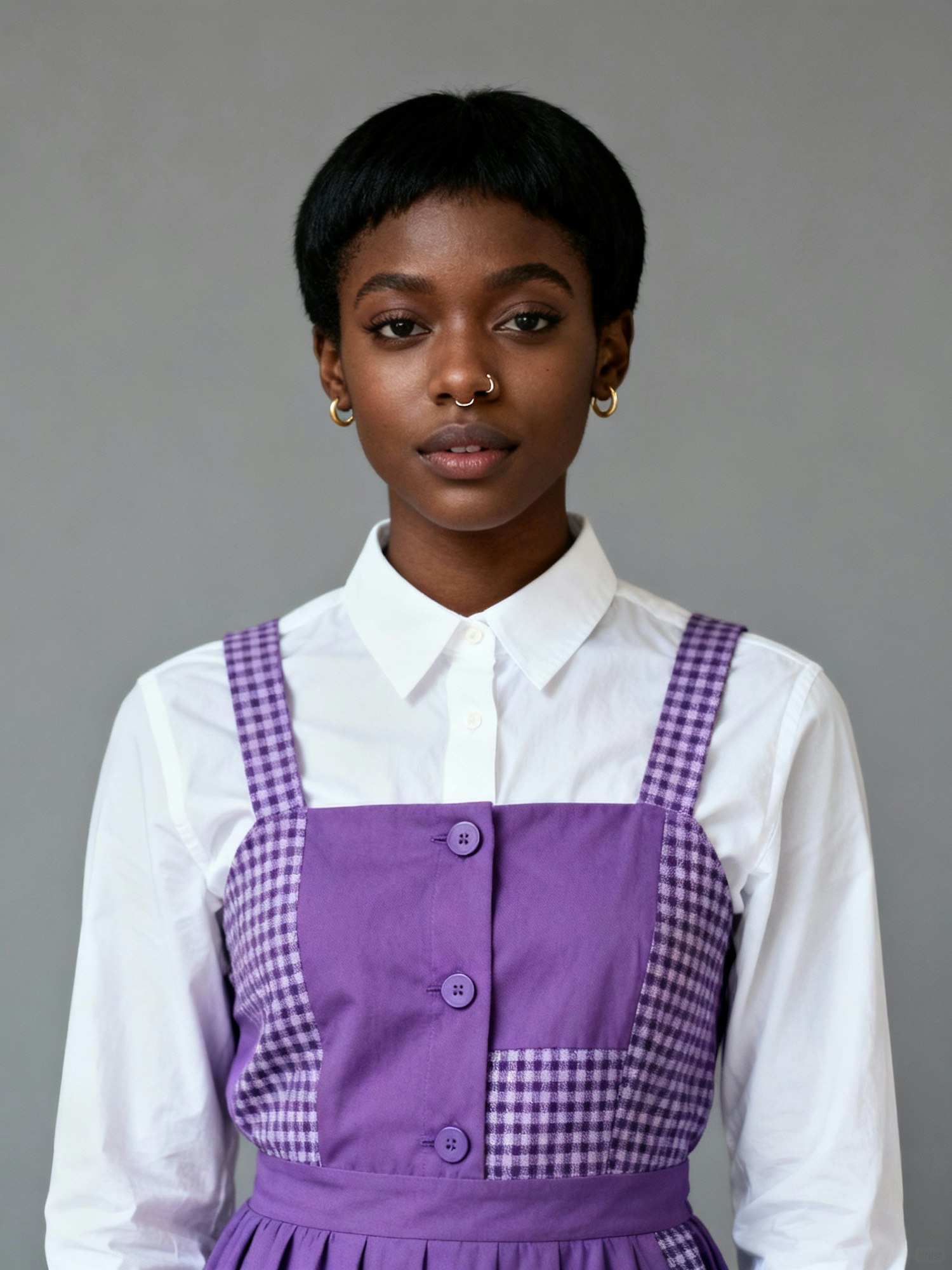 Waist-up, high-definition portrait of a Black woman wearing a purple pinafore-style dress layered over a crisp white button-up shirt with a collar and long sleeves. The dress blends checkered and plain patterns, with buttons running down the front. Her short black hair is styled simply, and she gazes confidently at the camera. She wears small gold hoop earrings and a tiny nose ring, adding subtle shine and personality. The neutral gray background enhances the purple tones of her outfit, making the layered textures stand out. Lighting is soft and directional, casting gentle highlights across her face and garment. The overall mood is modern, modest, and editorially sharp—ideal for a Gen Z fashion portrait or Afro-fusion identity showcase.