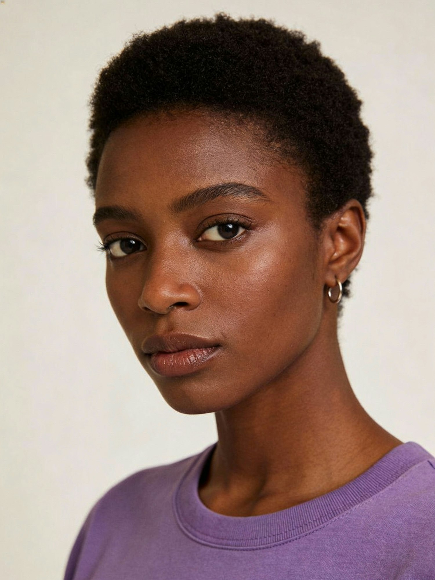 A Black woman with rich brown skin and short, natural, full hair gazes directly into the camera, his expression calm and grounded. She wears a purple crew neck shirt—simple, soft, and modern—paired with a small hoop earring in her left ear. The background is plain and light-toned, creating a clean visual field that draws focus to her face and silhouette. Lighting is soft and even, highlighting skin texture, the gentle curve of the neckline, and the subtle metallic glint of the earring. The mood is introspective and quietly confident, blending minimalism with emotional resonance. Hyperrealistic rendering should emphasize skin detail, fabric texture, and tonal harmony across wardrobe, background, and complexion.