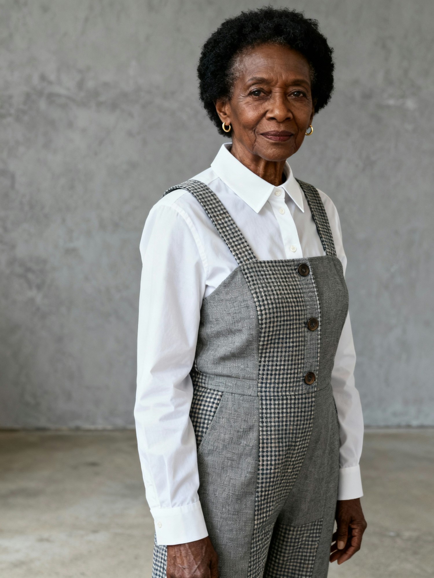 Waist-up, high-definition portrait of a old age Black woman standing against textured gray walls and a smooth concrete floor. She wears a pinafore-style jumpsuit layered over a crisp button-up shirt with a collar and long sleeves reaching her wrists. The dress blends checkered and plain patterns, with buttons running down the front. Her short black curly hair is styled simply, and she gazes confidently at the camera. Her melanin glows under soft, directional lighting. She wears small gold hoop earrings, adding subtle shine and personality. The neutral gray background enhances the tones of her outfit, making the layered textures stand out. The overall mood is modern, modest, and editorially sharp—ideal for a Gen Z fashion portrait or Afro-fusion identity showcase.