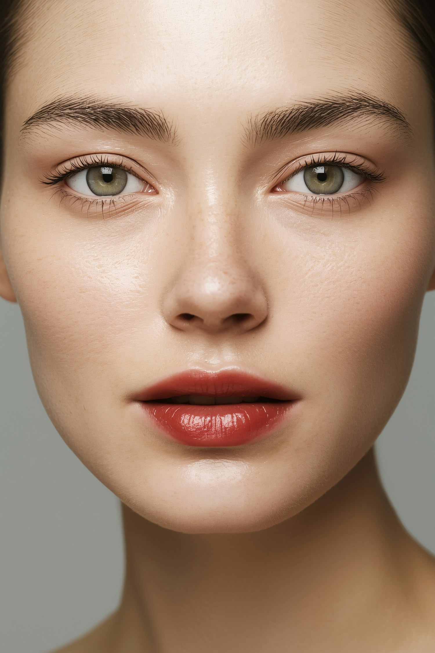 Close-up of a person with green eyes, fair skin, and glossy red lips, showcasing natural beauty and soft lighting.