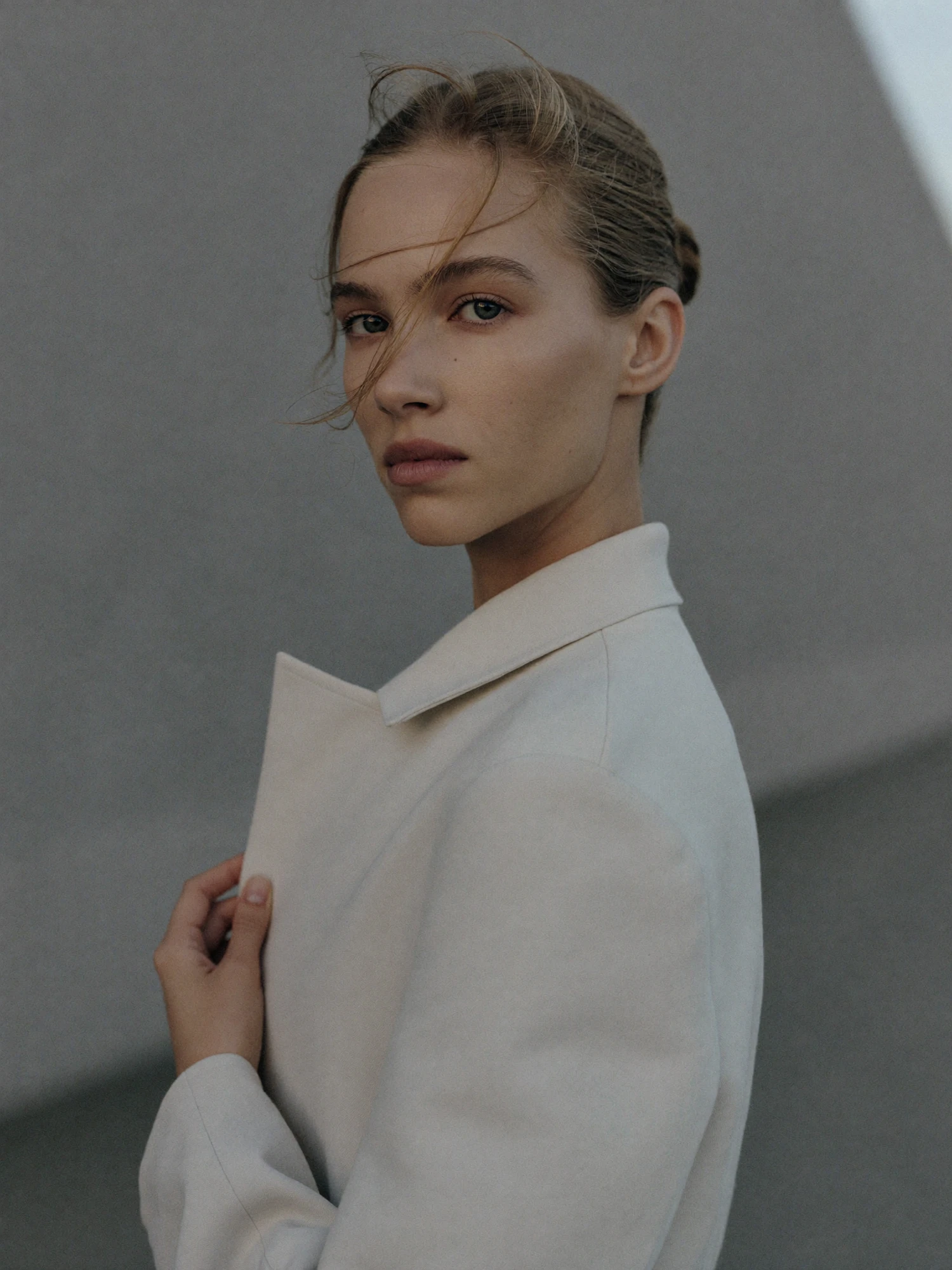 A person in a light coat gazes calmly at the camera against a neutral background, highlighting their serene expression and elegant style.
