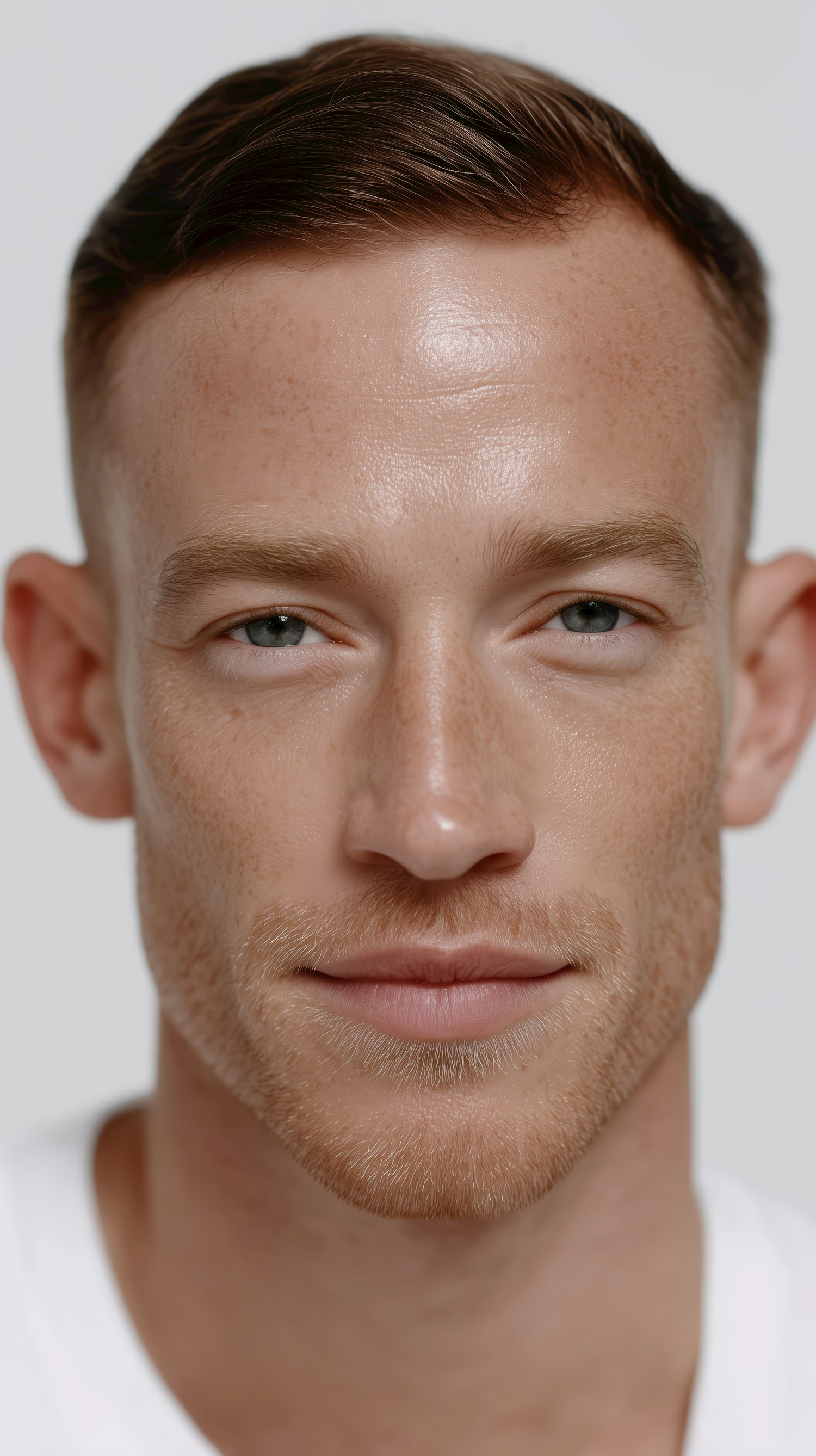 Close-up of a man with short brown hair, light stubble, green eyes, and freckles, set against a plain light background.
