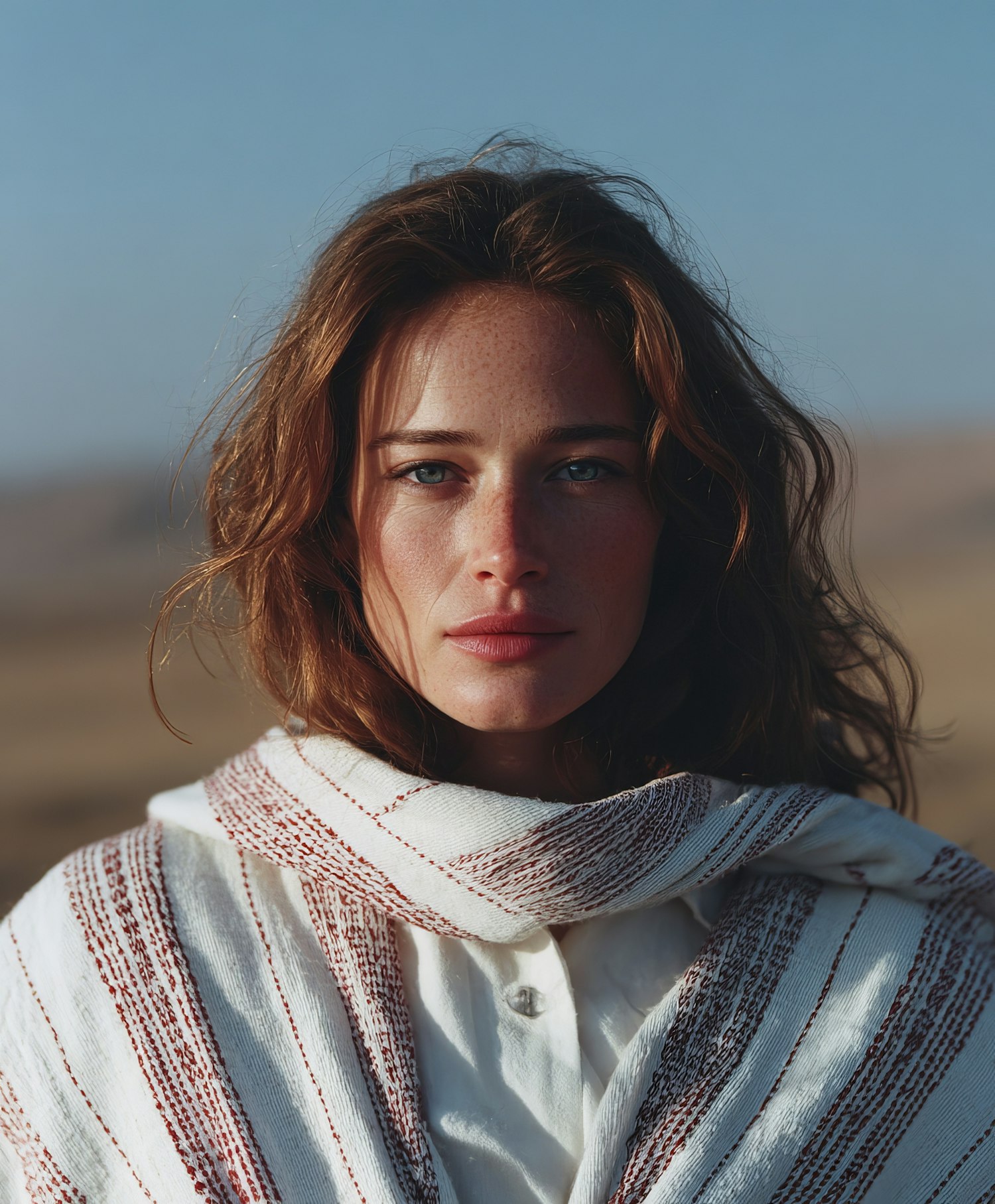 A woman with auburn hair and blue eyes wearing a patterned scarf stands against a blurred desert background under a clear sky.