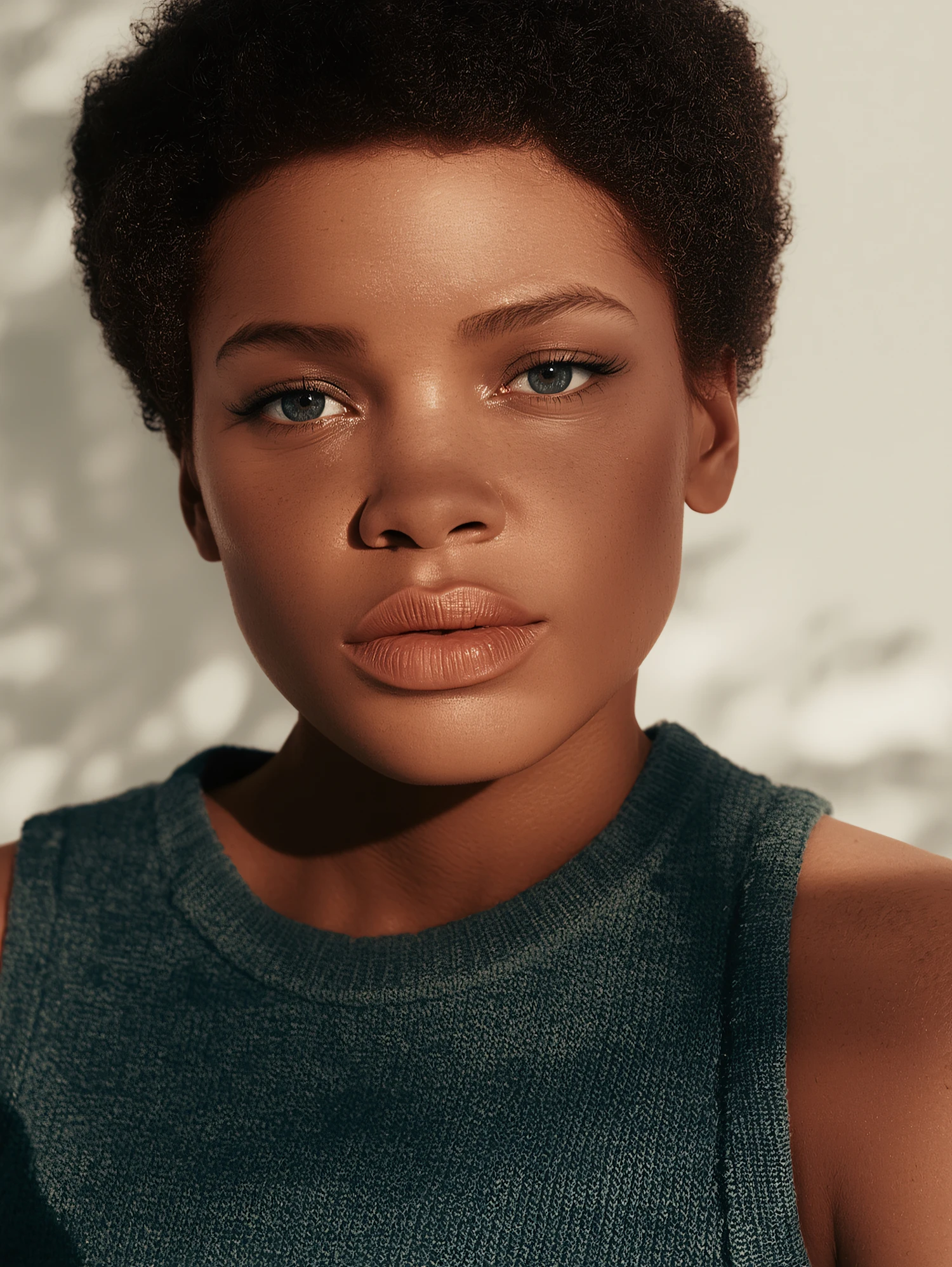Close-up portrait of a person with short curly hair, blue eyes, and a green top, captured in soft natural light.