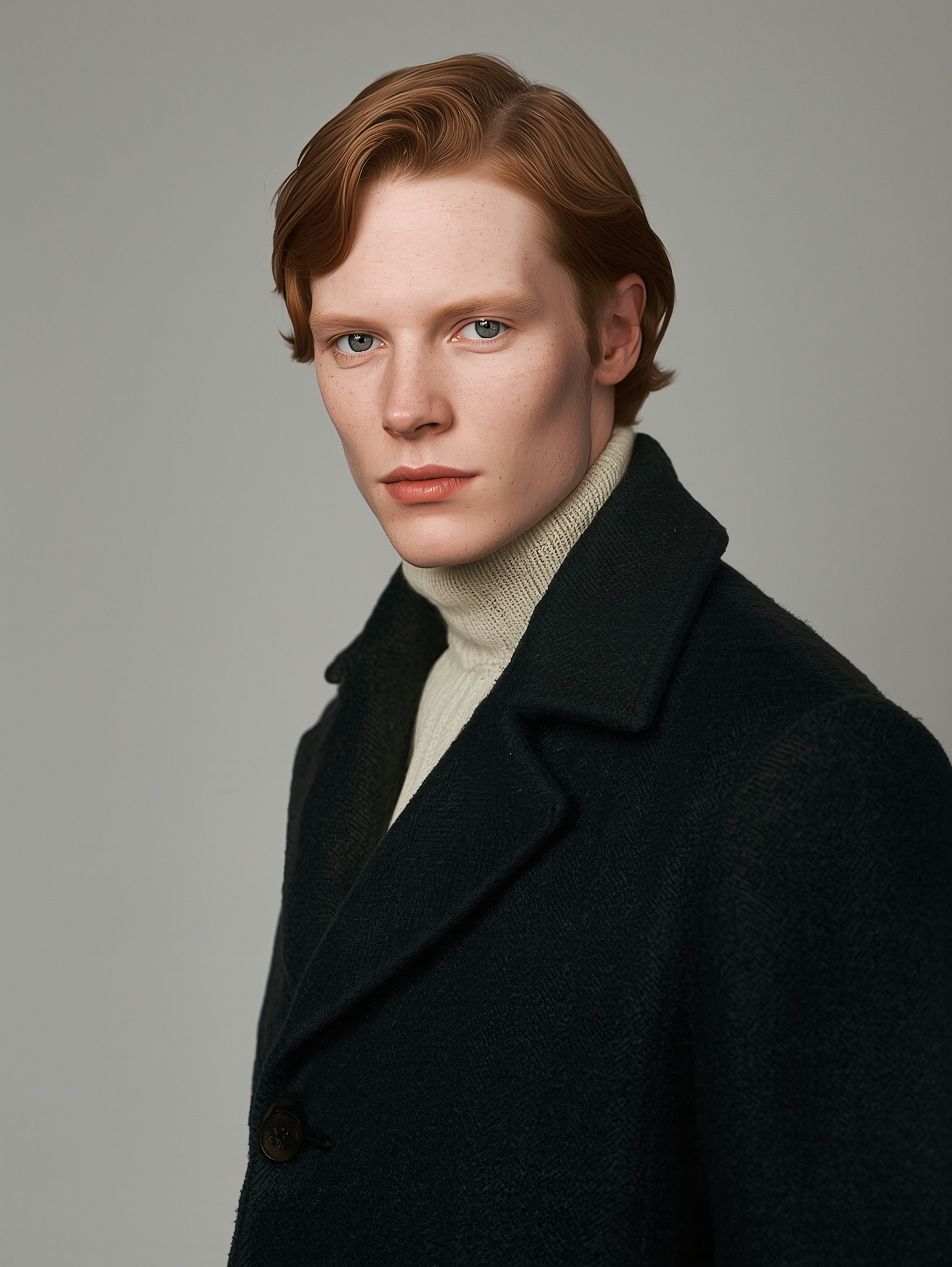 Portrait of a person with auburn hair, light blue eyes, and a dark coat over a light turtleneck, set against a neutral background.