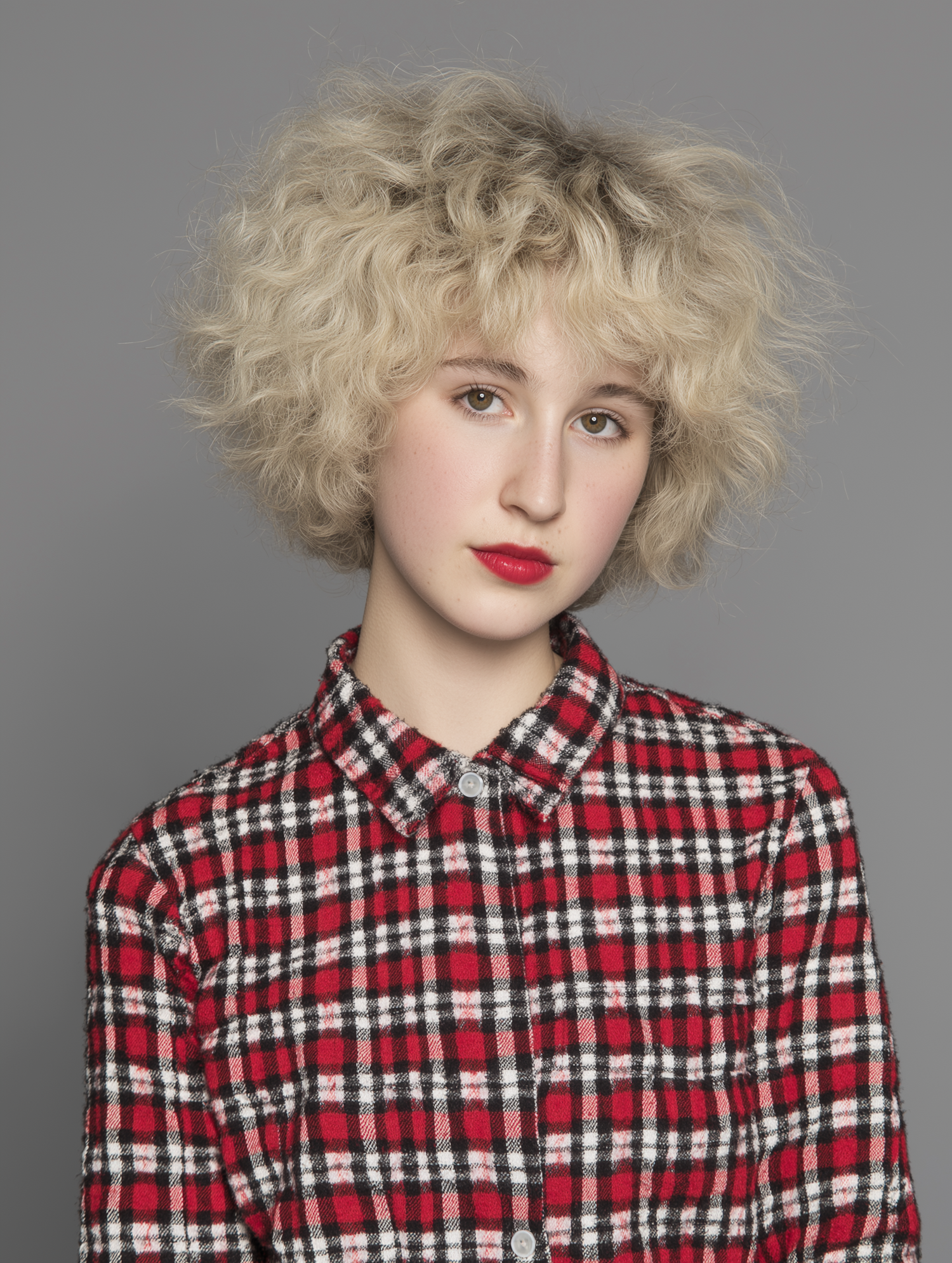 A person with curly blonde hair and a red plaid shirt poses against a gray background, showcasing a stylish and natural look.