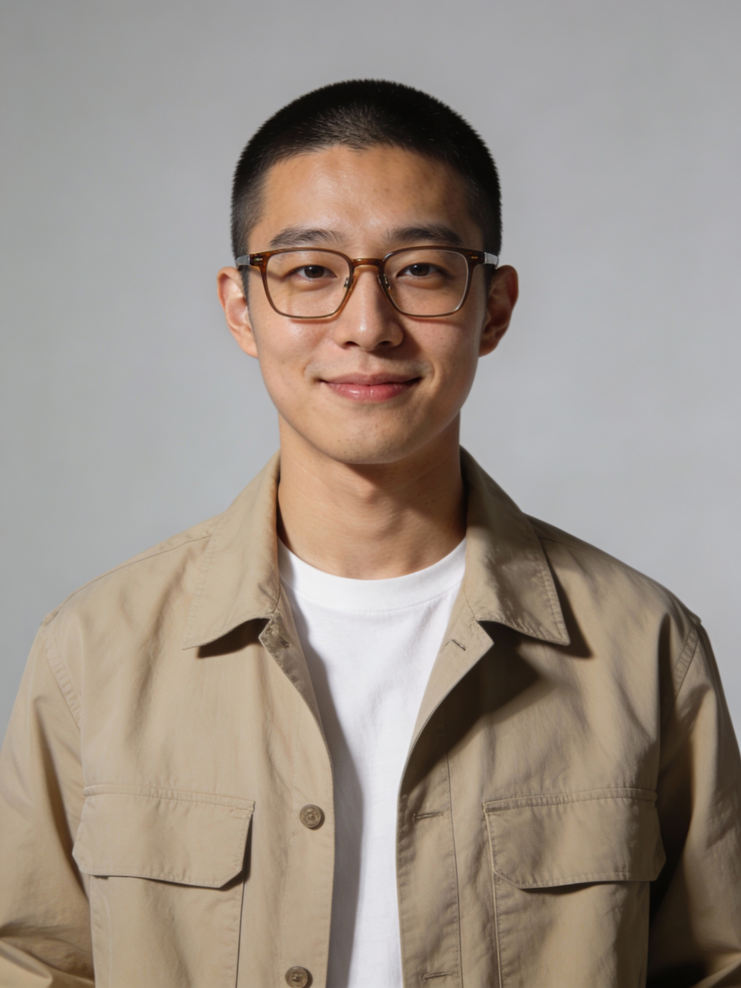 Portrait of a person with glasses, wearing a beige jacket and white shirt, set against a plain light background.