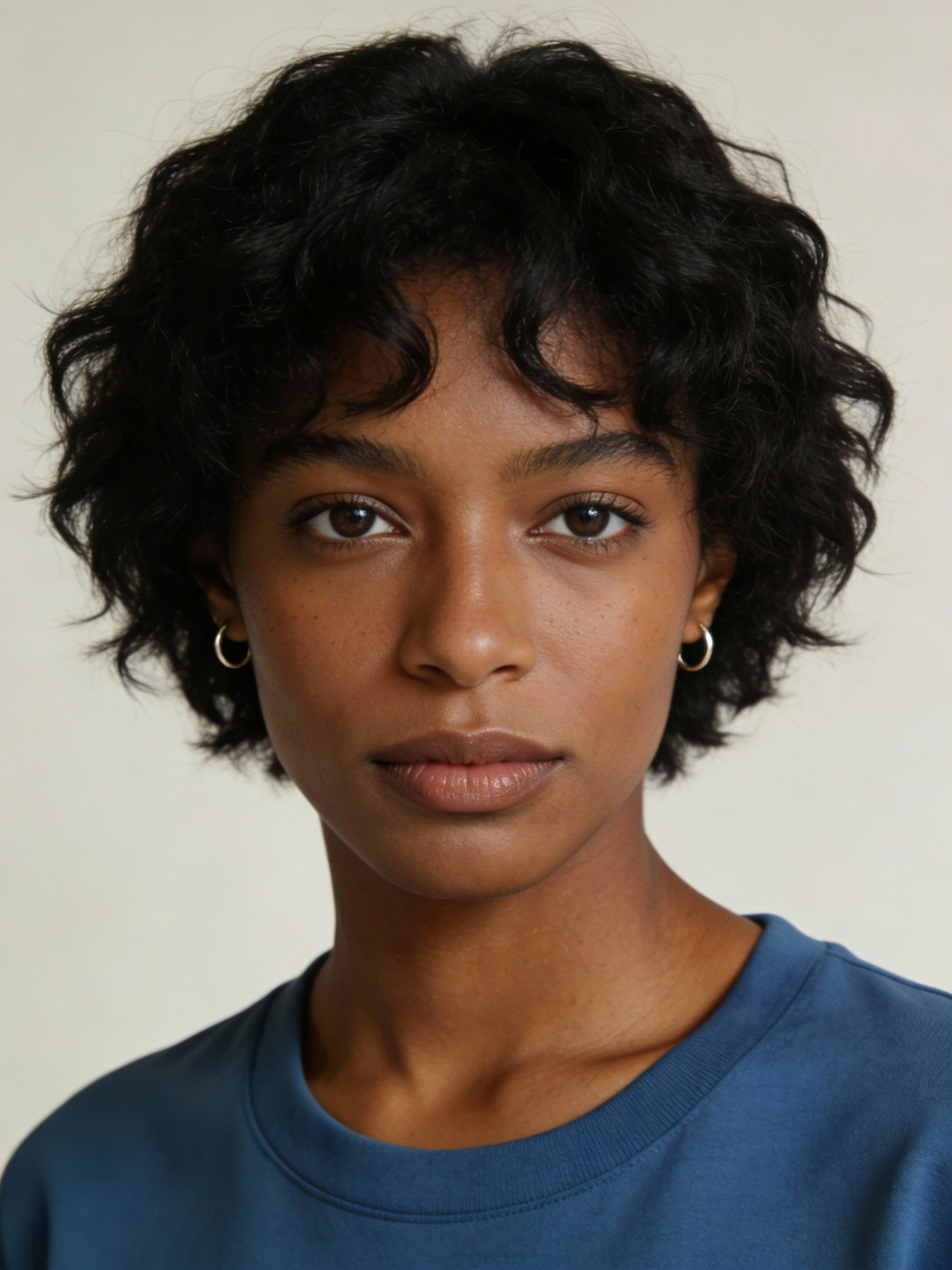 A Portrait of a person with wavy black hair, wearing a green shirt with a yellow collar, set against a vibrant green background. With rich brown skin and short, natural, full hair gazes directly into the camera, his expression calm and grounded. She wears a blue crew neck shirt—simple, soft, and modern—paired with a small hoop earring in her left ear. The background is plain and light-toned, creating a clean visual field that draws focus to her face and silhouette. Lighting is soft and even, highlighting skin texture, the gentle curve of the neckline, and the subtle metallic glint of the earring. The mood is introspective and quietly confident, blending minimalism with emotional resonance. Hyperrealistic rendering should emphasize skin detail, fabric texture, and tonal harmony across wardrobe, background, and complexion.