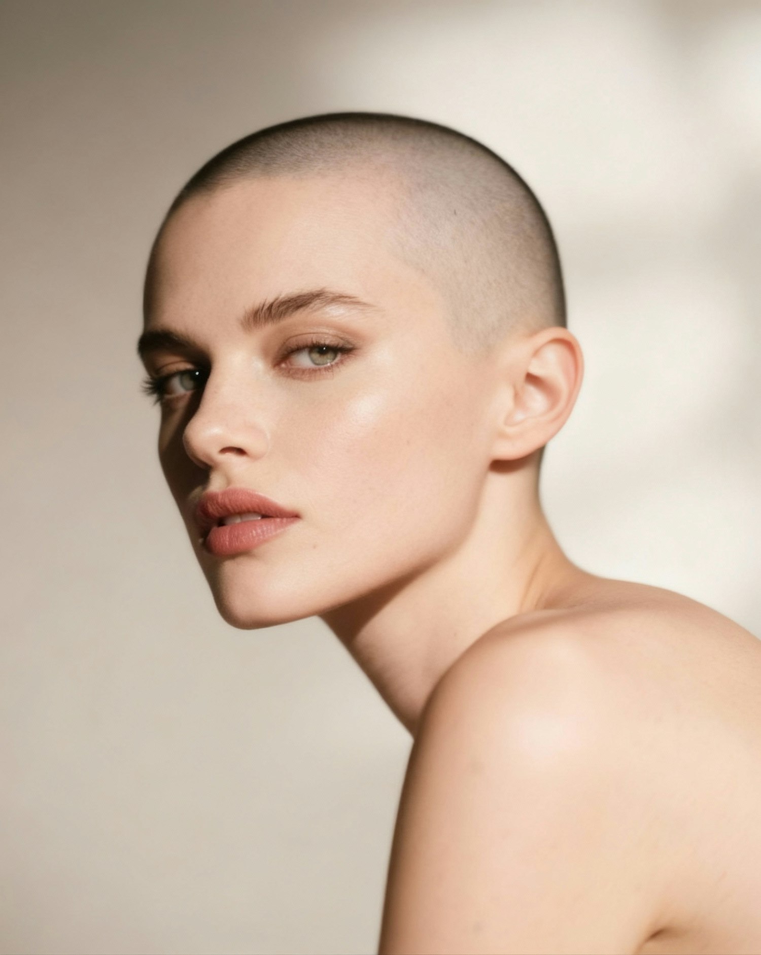 Close-up portrait of a person with a shaved head and green eyes, captured in soft lighting with a neutral background.