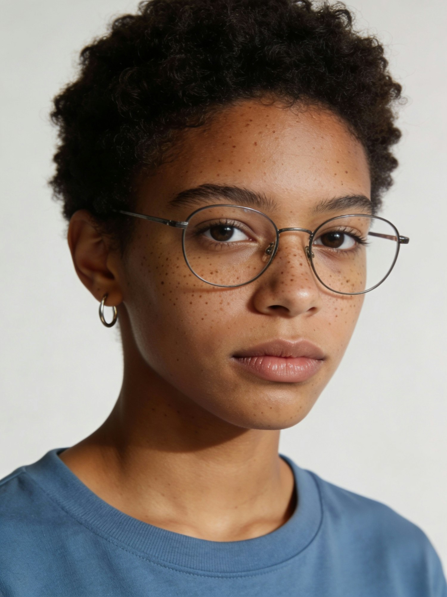 A young person with curly hair, freckles, and glasses, wearing a green sweater and polka-dot shirt, against a bright green background. with rich brown skin and short, natural, full hair gazes directly into the camera, his expression calm and grounded. She wears a blue crew neck shirt—simple, soft, and modern—paired with a small hoop earring in her left ear. The background is plain and light-toned, creating a clean visual field that draws focus to her face and silhouette. Lighting is soft and even, highlighting skin texture, the gentle curve of the neckline, and the subtle metallic glint of the earring. The mood is introspective and quietly confident, blending minimalism with emotional resonance. Hyperrealistic rendering should emphasize skin detail, fabric texture, and tonal harmony across wardrobe, background, and complexion.