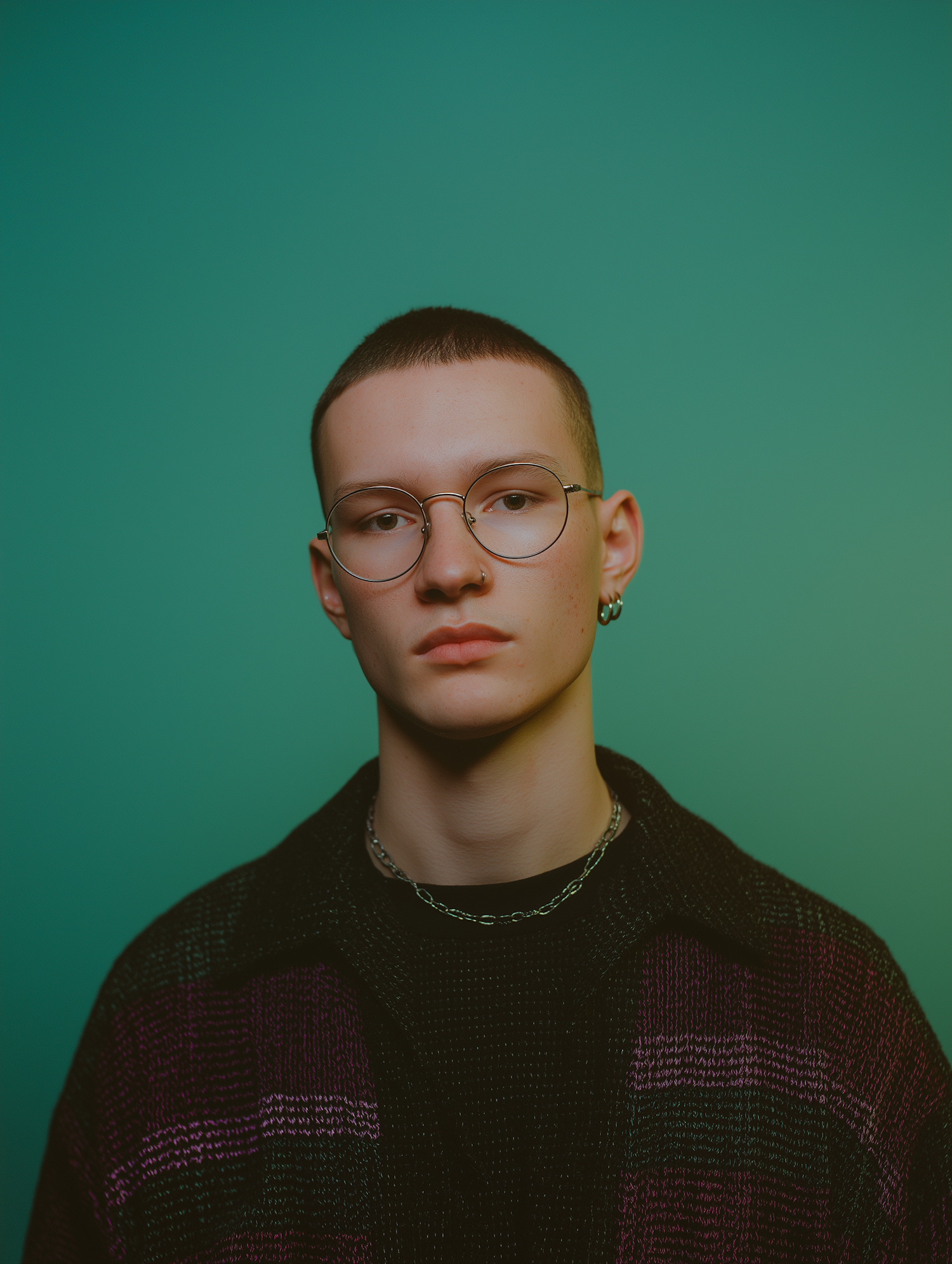 Portrait of a young person with glasses and a short haircut, wearing a dark sweater and chain necklace against a green background.