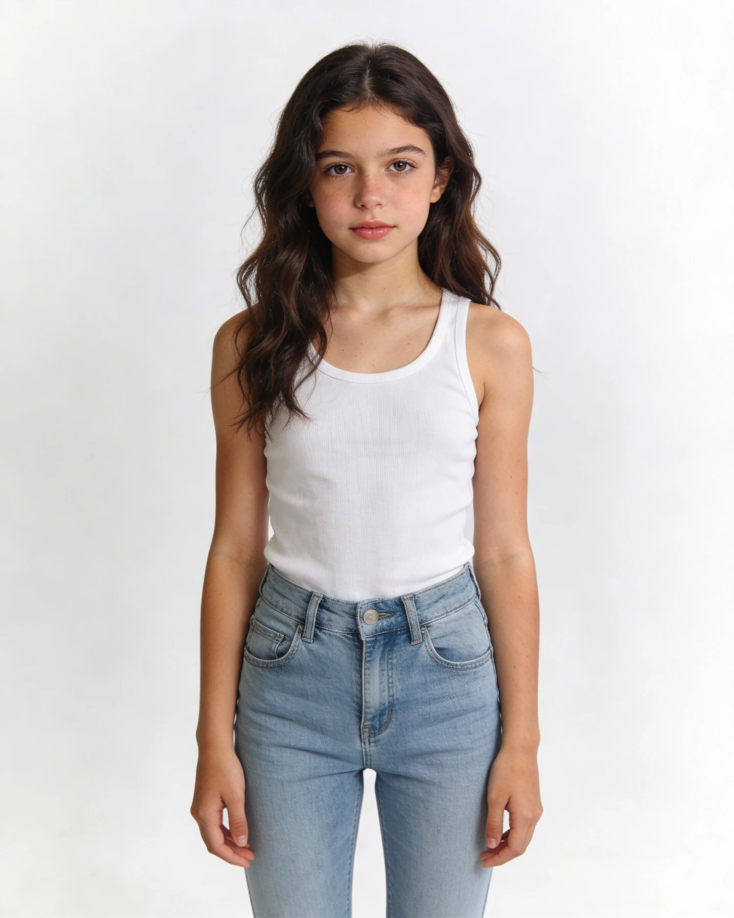 Ultra realistic studio fashion photography, young woman around 25 years old, an original, childlike beauty, Mediterranean features, long dark brown slightly wavy hair, natural glowing skin, soft natural makeup, slim silhouette, long legs, relaxed confident posture, standing straight facing camera, arms relaxed along body, neutral calm expression, wearing simple fitted white tank top and light blue high-waisted jeans, white seamless studio background, soft diffused lighting, minimal shadows, neutral color balance, commercial model test shoot aesthetic, 85mm lens look, high detail, natural proportions
