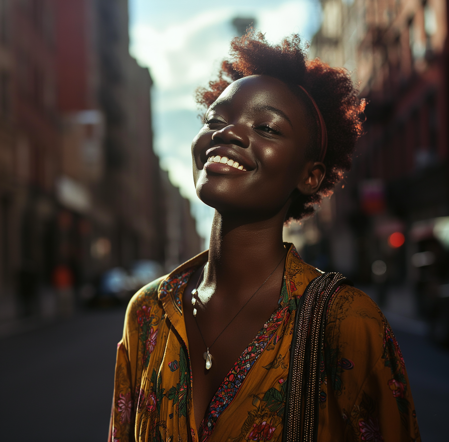 Joyful woman in a vibrant yellow blouse smiles in a sunlit urban street, exuding happiness and warmth.