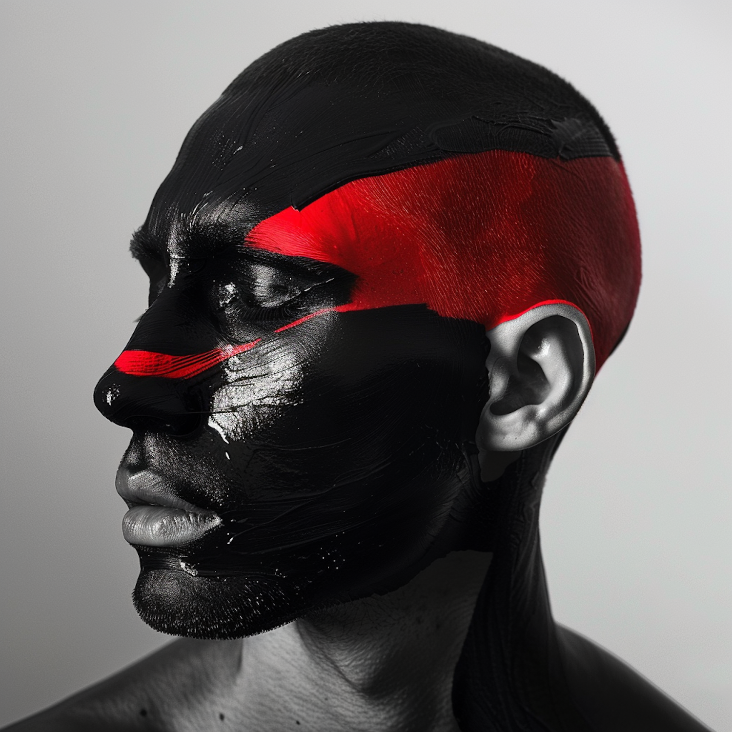 Profile of a person with black and red face paint, creating a striking artistic contrast. Shaved head, neutral expression, gray background.