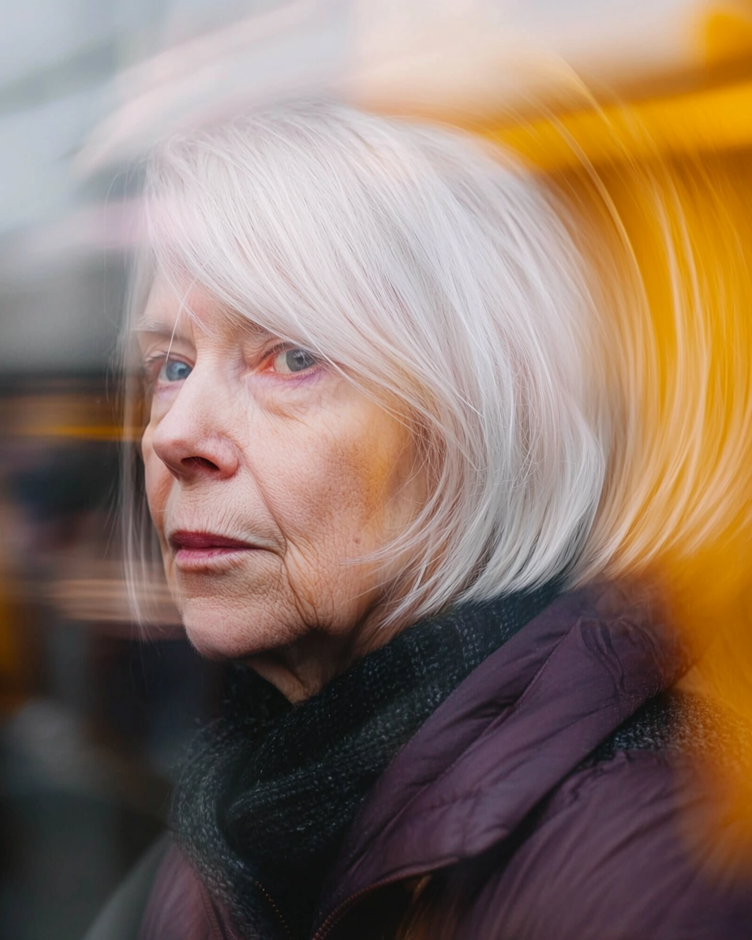 Close-up of an older woman with white hair and a neutral expression, set against a blurred background with warm yellow and orange tones.