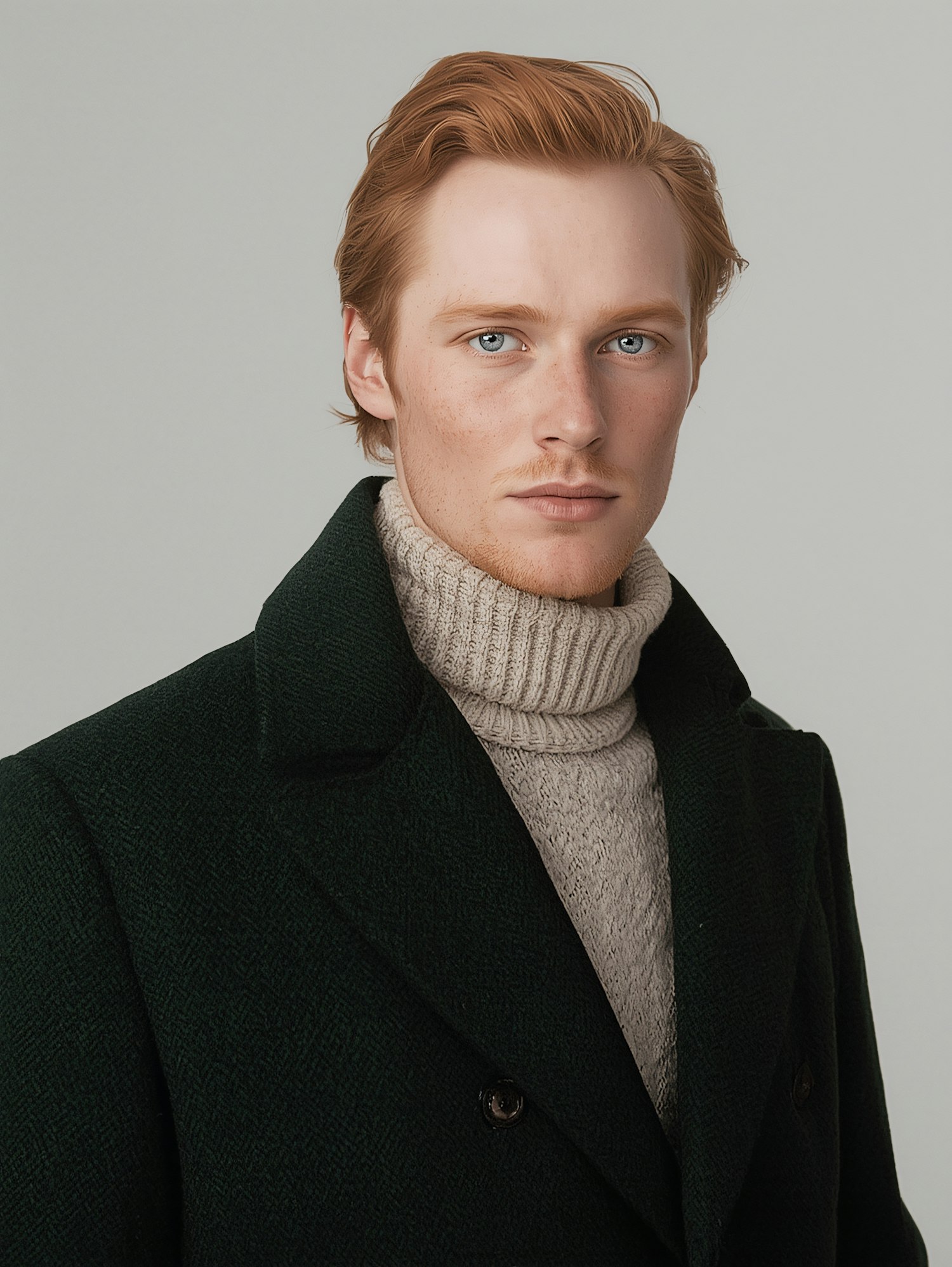 Portrait of a man with red hair, light blue eyes, and a dark green coat over a beige turtleneck, set against a neutral gray background.