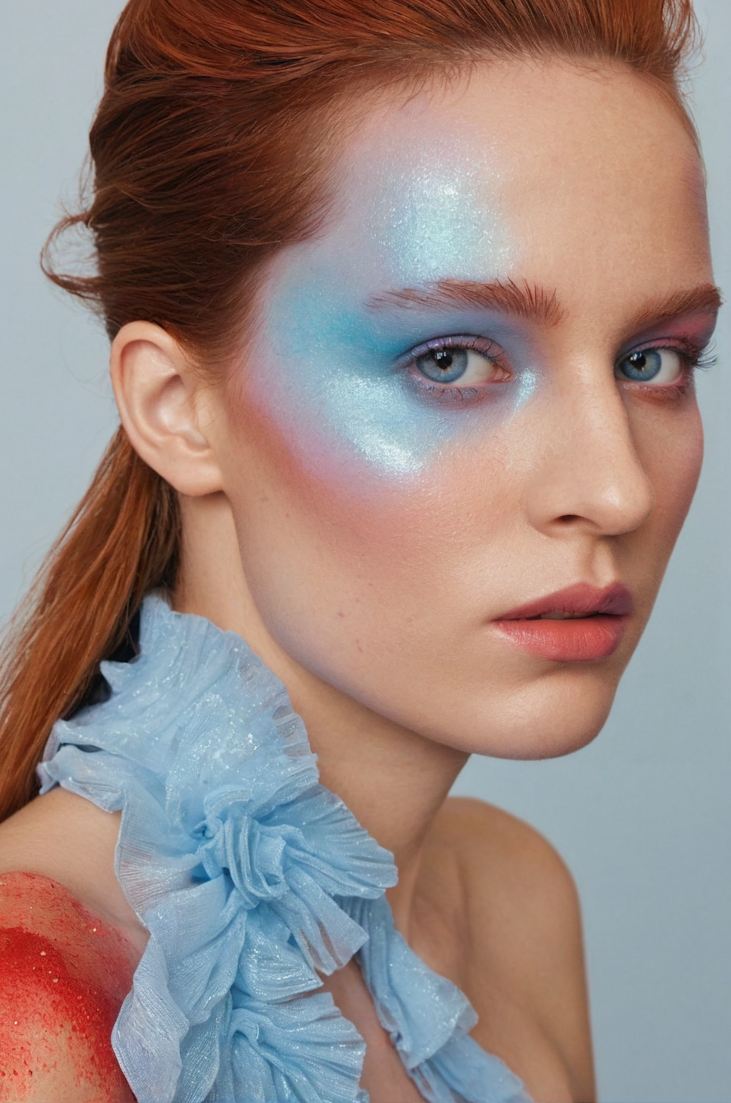 Artistic portrait highlighting detailed makeup with vibrant colors and a dramatic look.