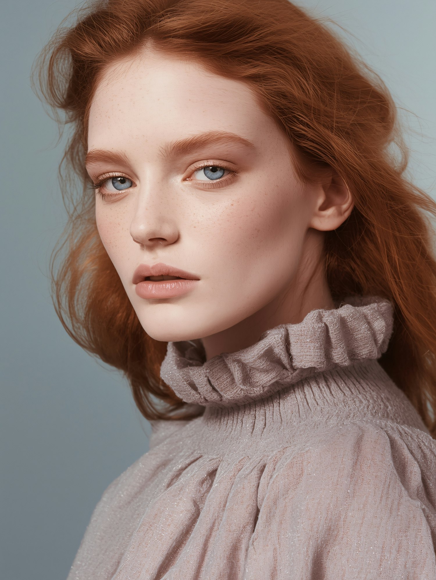 Close-up of a woman with red hair, blue eyes, and a lavender blouse, set against a muted blue background.