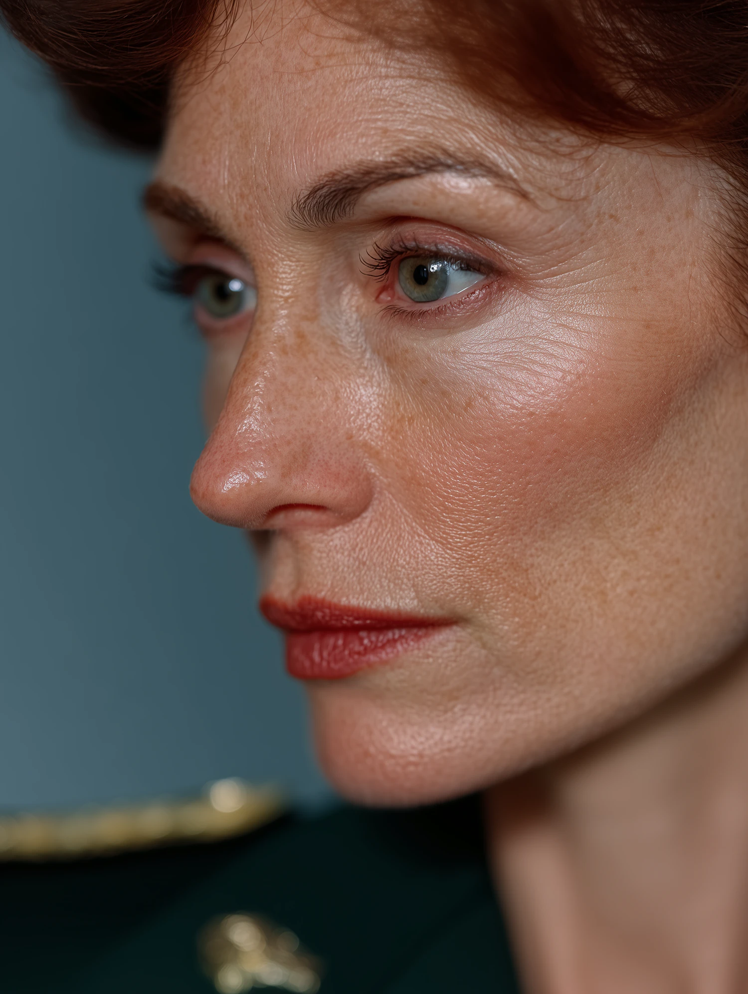 Close-up of a woman in a green uniform, showcasing her sharp features, red hair, and natural freckles against a muted blue background.