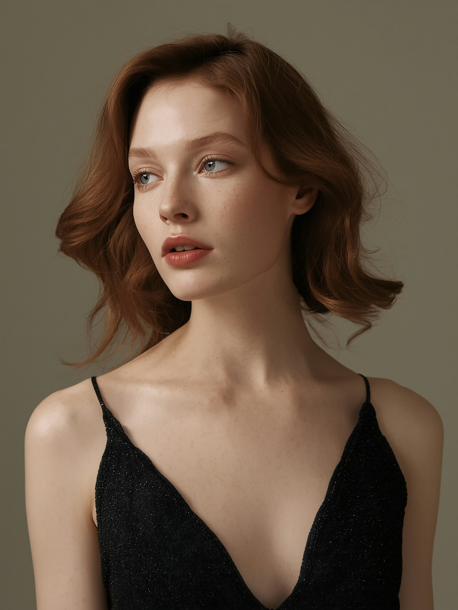 Portrait of a red-haired woman in a black top, with soft lighting and a neutral background, showcasing her natural beauty.