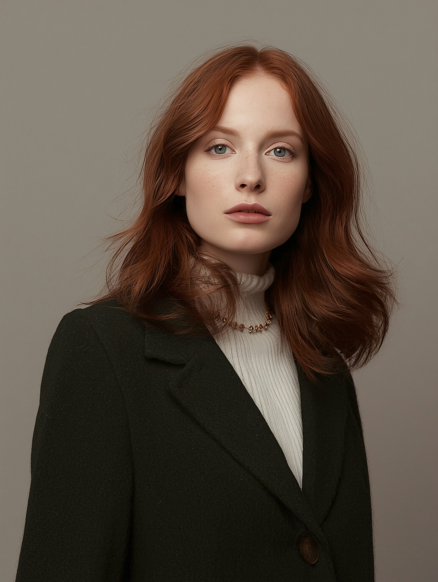 Portrait of a woman with red hair, wearing a green blazer and white turtleneck, set against a neutral gray background.