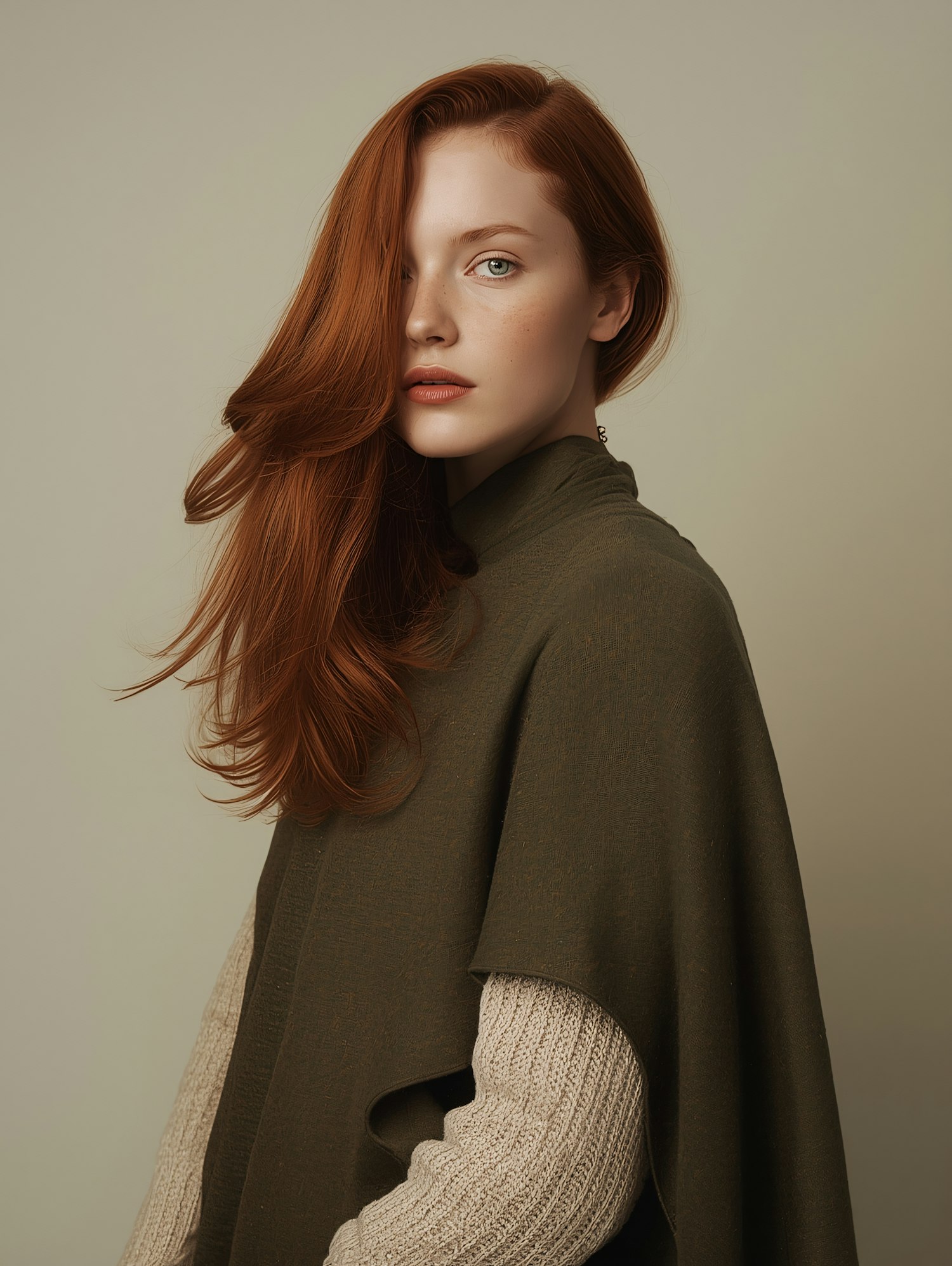 Portrait of a young woman with red hair and green eyes, wearing a beige sweater and olive-green shawl, set against a neutral background.