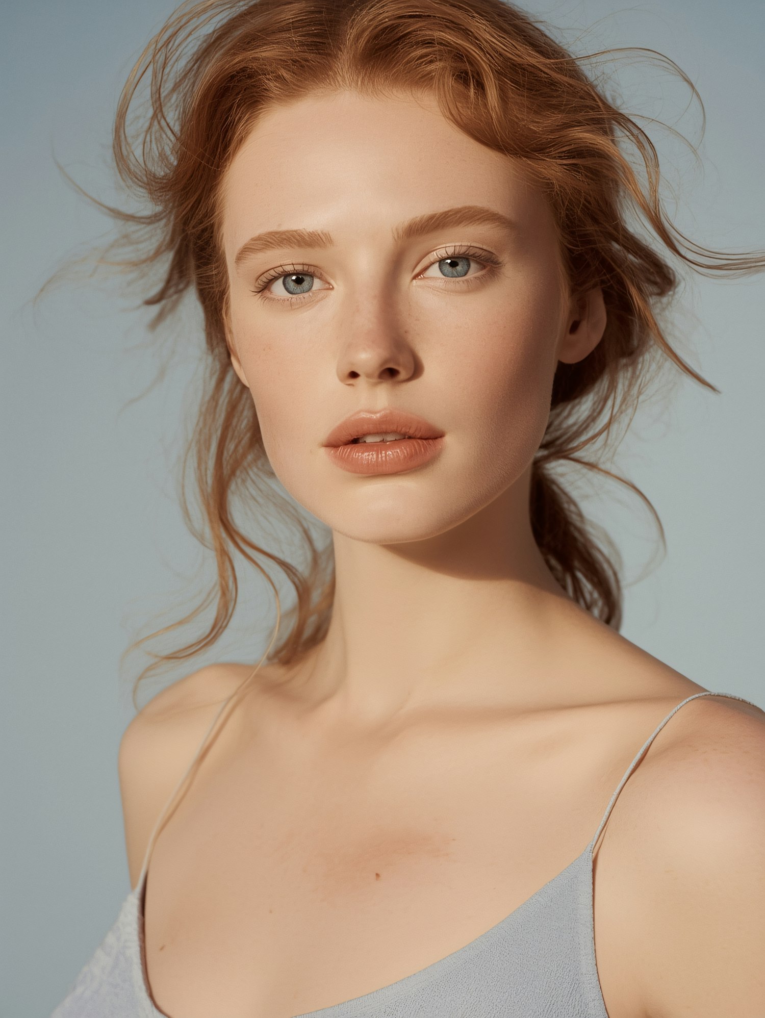 Portrait of a red-haired woman with blue eyes, wearing a light blue top against a soft blue background, showcasing natural beauty.