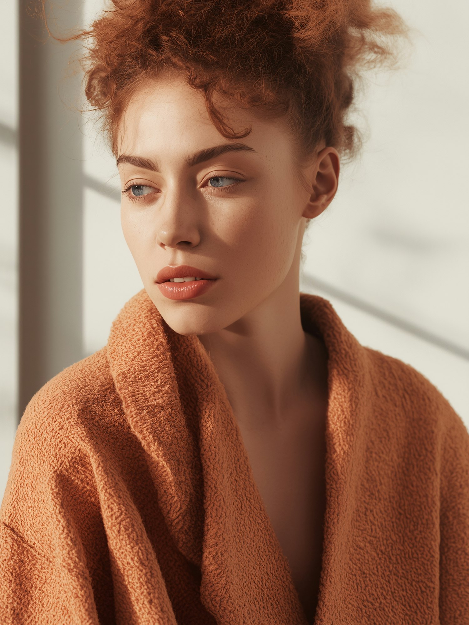 Close-up of a woman with red curly hair in an orange robe, gazing thoughtfully to the side in soft natural light.