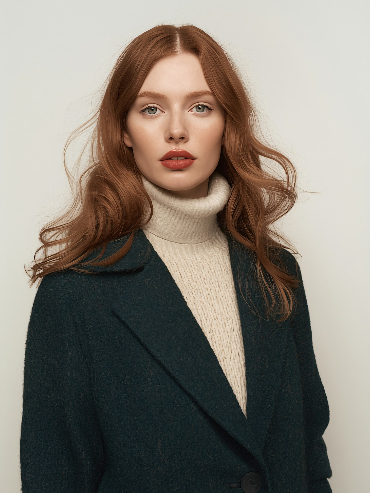 Portrait of a woman with red hair, wearing a dark green coat and cream turtleneck, set against a light background.