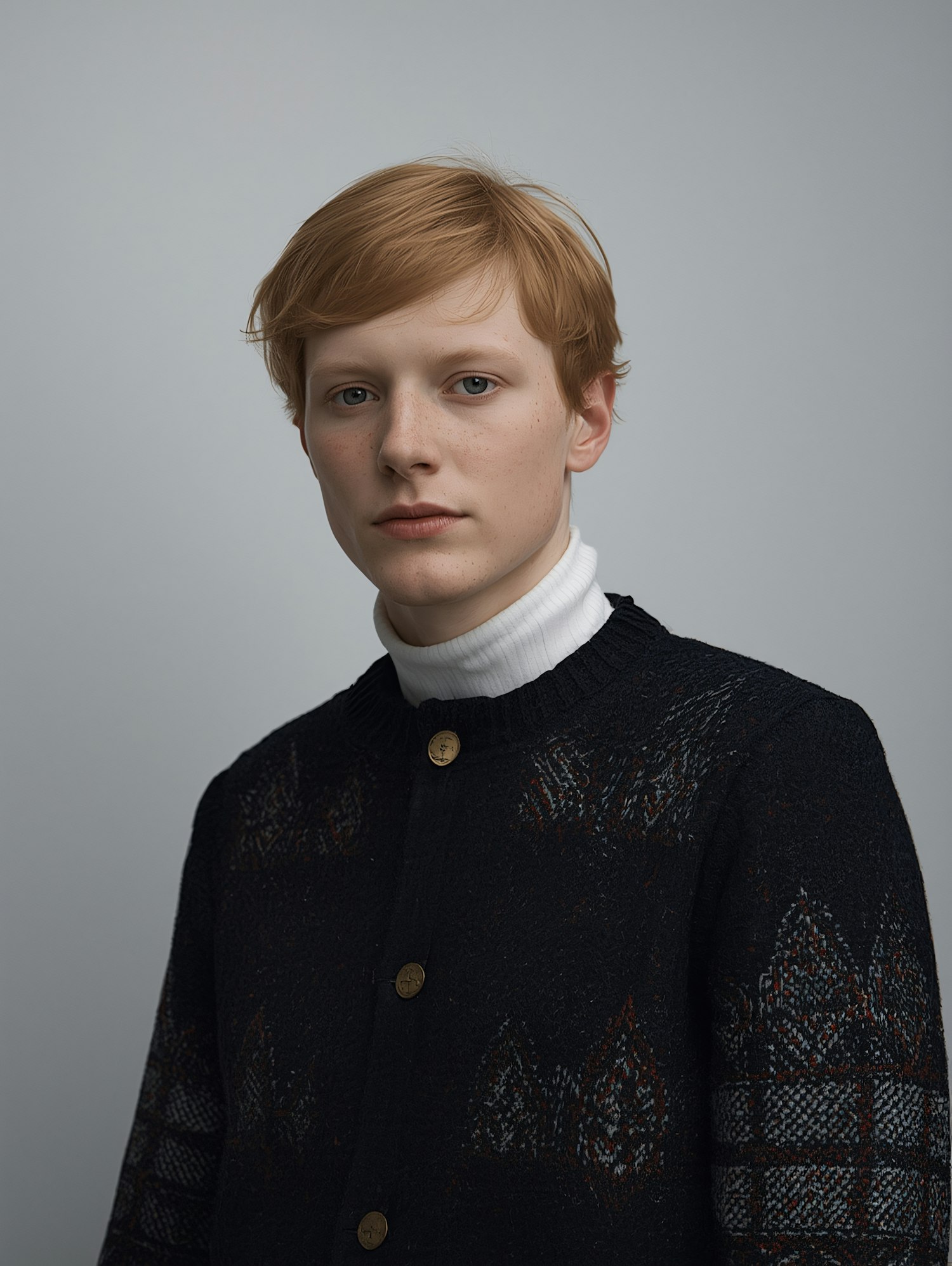 Portrait of a young person with red hair in a dark sweater and white turtleneck, set against a plain gray background.