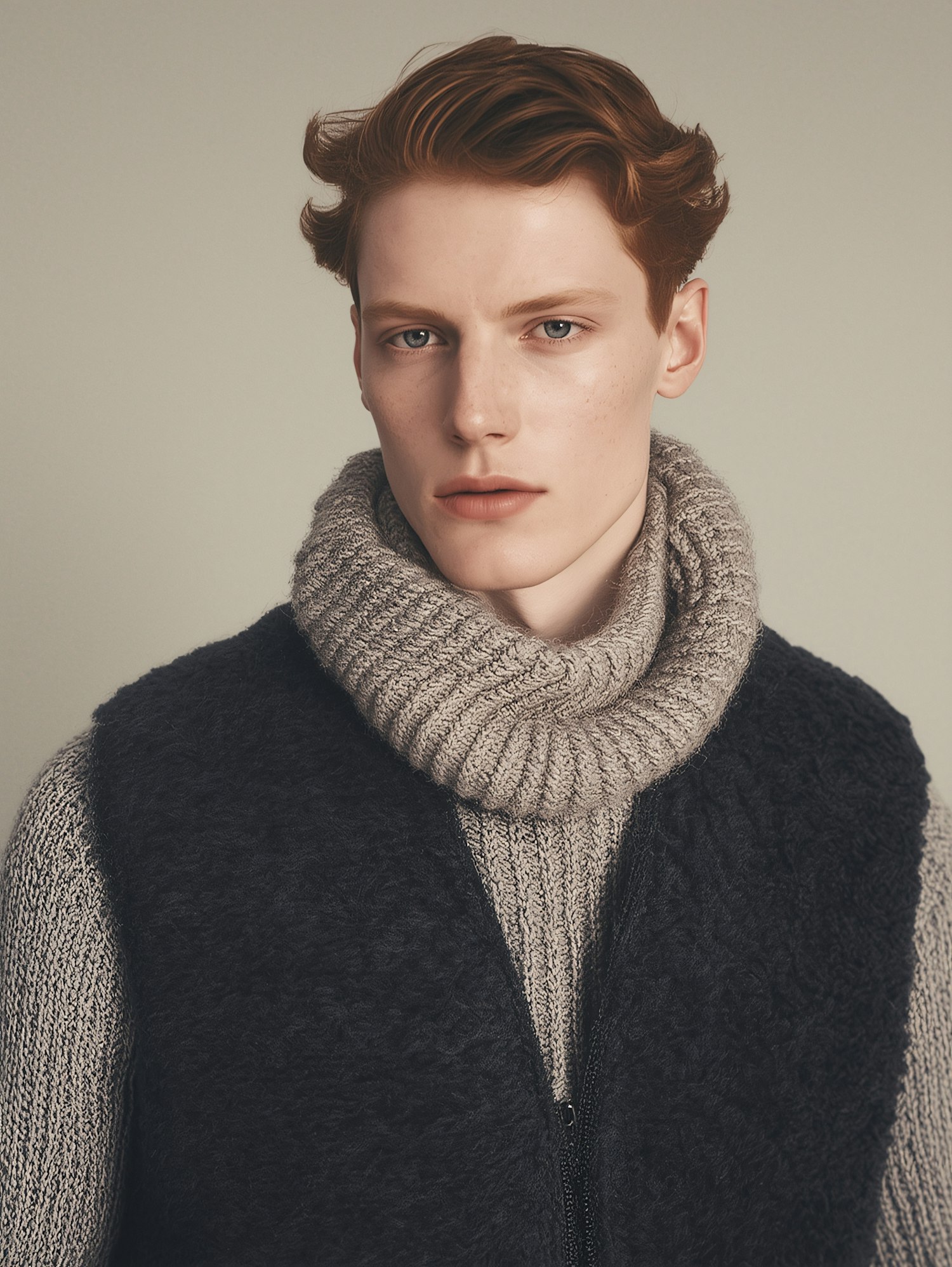 Portrait of a young person with red hair in a gray turtleneck and dark vest, set against a neutral background.