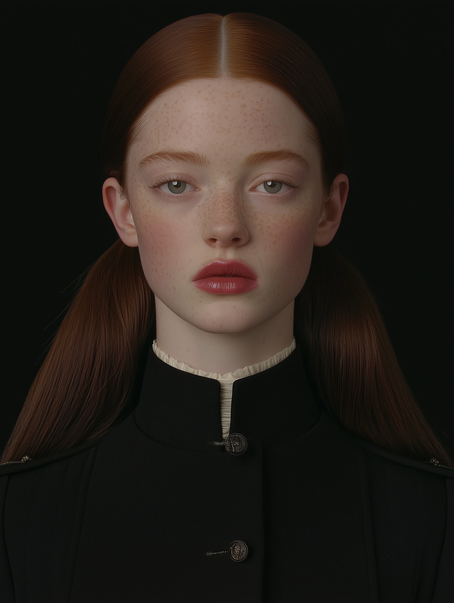 A striking portrait of a young woman with red hair, freckles, and a black high-collared coat, set against a dark background.
