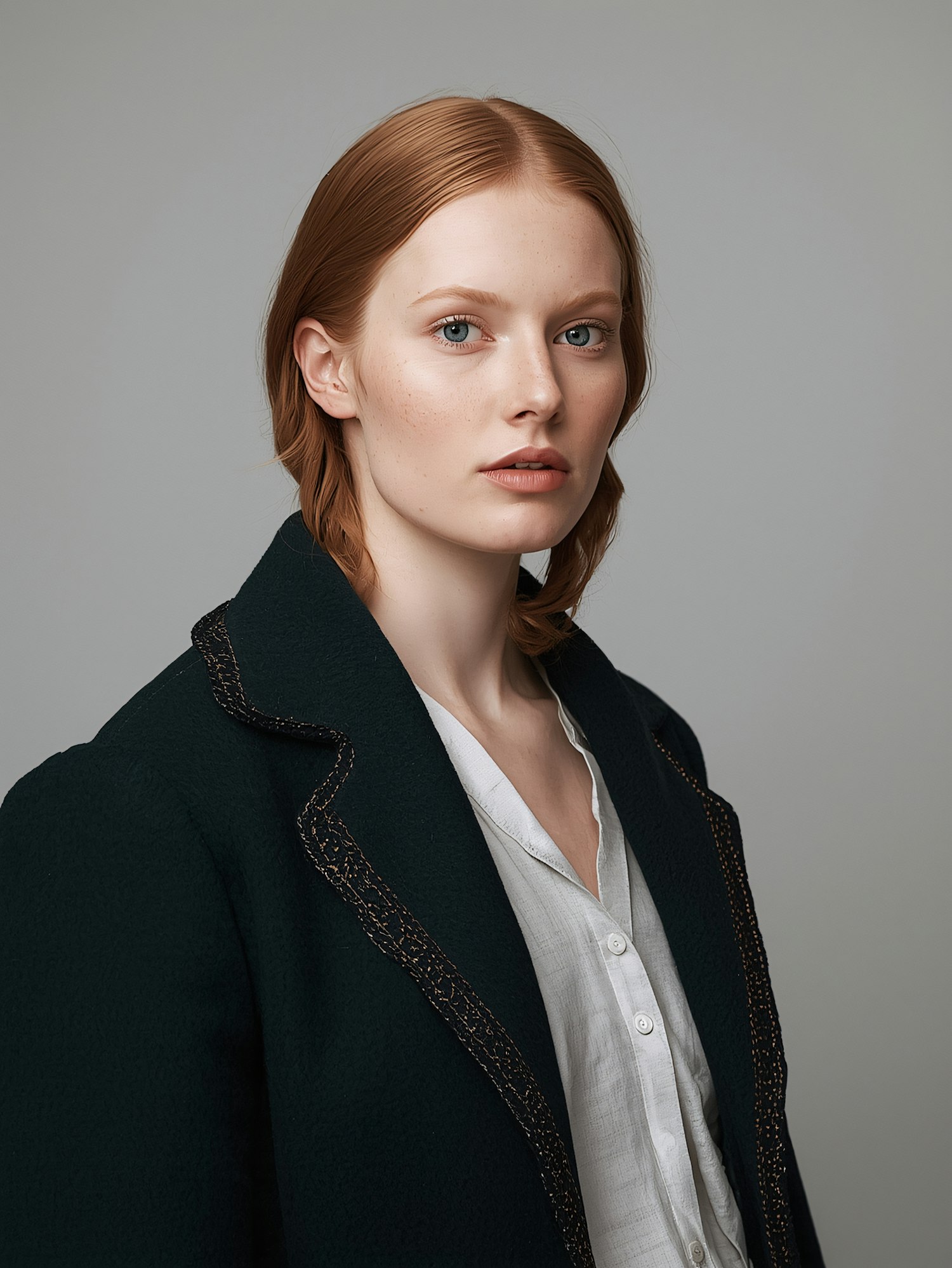 Portrait of a young woman with red hair, wearing a green coat with gold embroidery and a white shirt, set against a neutral background.